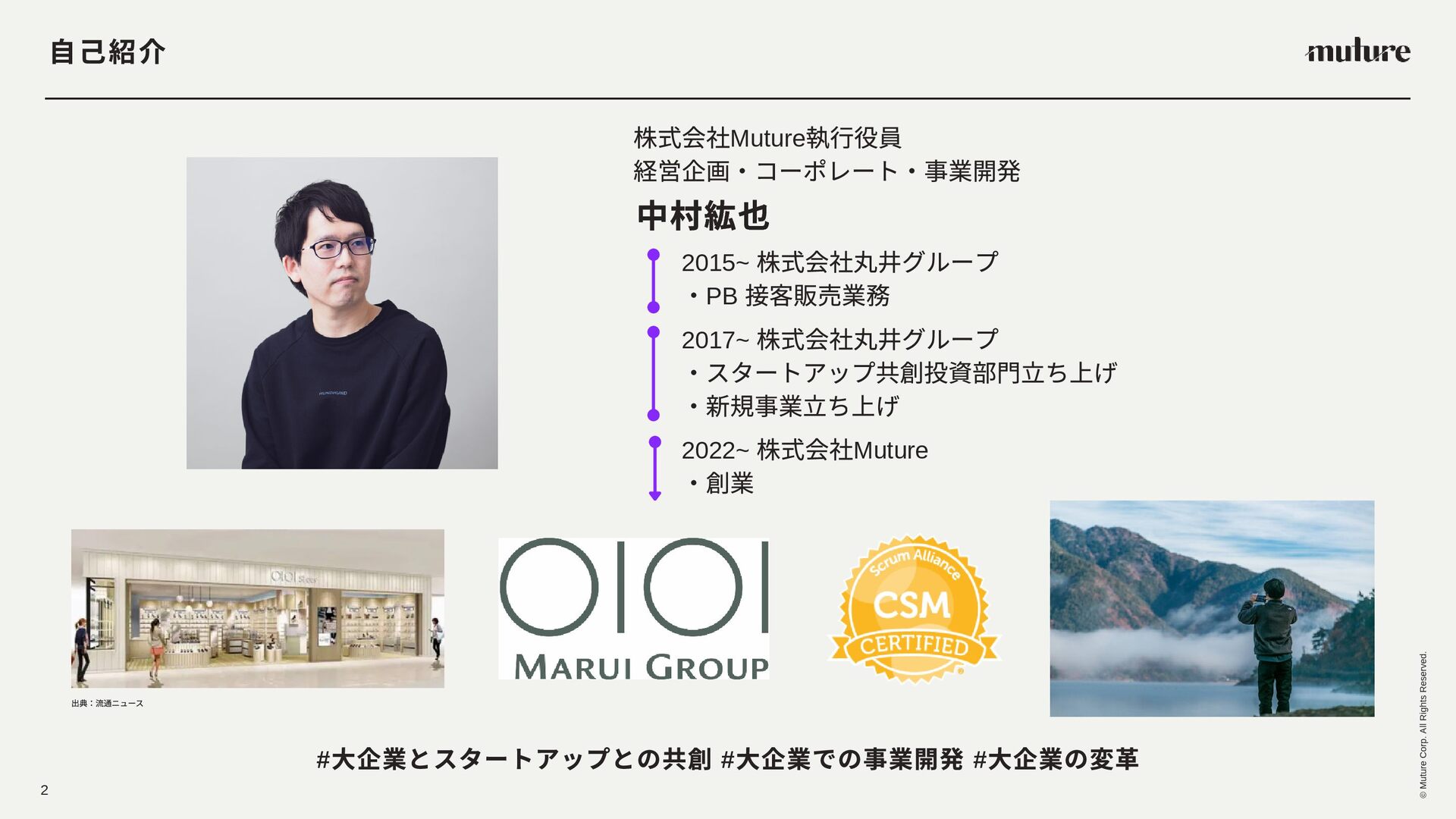 中村紘也 2015~ 株式会社丸井グループ ・PB 接客販売業務 2017~ 株式会社丸井グループ ・スタートアップ共創投資部門立ち上げ ・新規事業立ち上げ 2022~ 株式会社Muture ・創業 出典:流通ニュース # 大企業とスタートアップとの共創 # 大企業での事業開発 # 大企業の変革 2