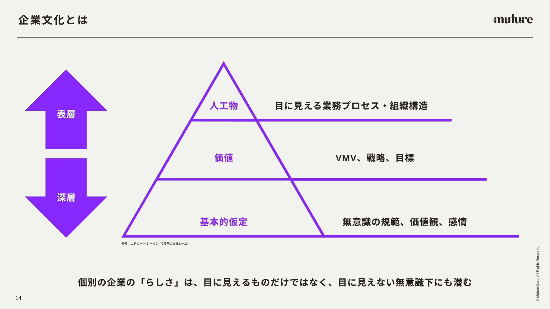 10. 企業文化とは © Muture Corp. All Rights Reserved. 表層 個別の企業の「らしさ」は、目に見えるものだけではなく、目に見えない無意識下にも潜む 参考:エドガー