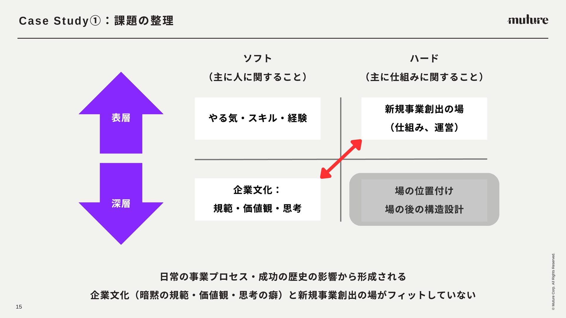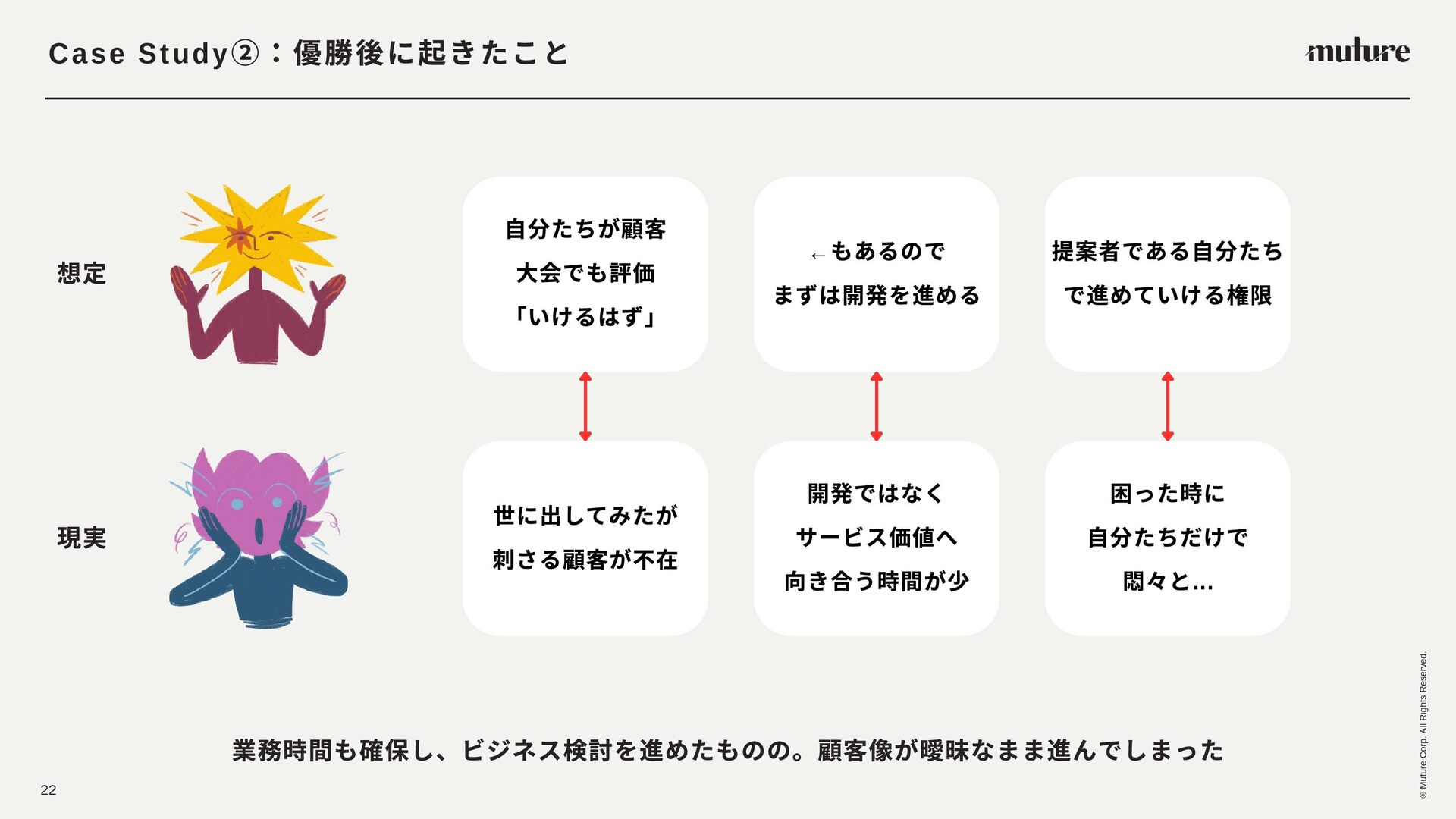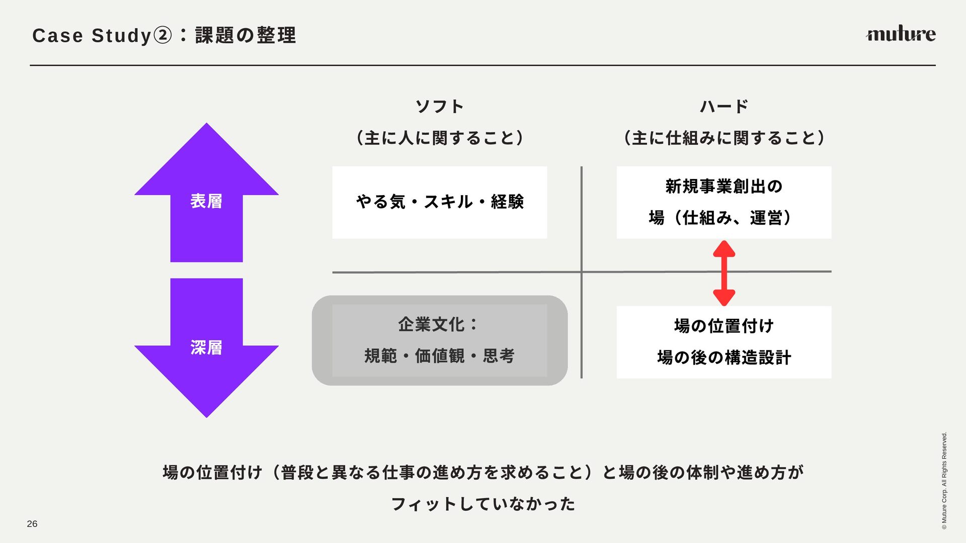 21. Case Study ②:課題の整理 © Muture Corp. All Rights Reserved. 場の位置付け(普段と異なる仕事の進め方を求めること)と場の後の体制や進め方が