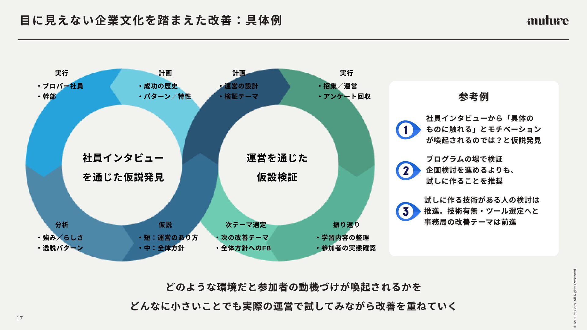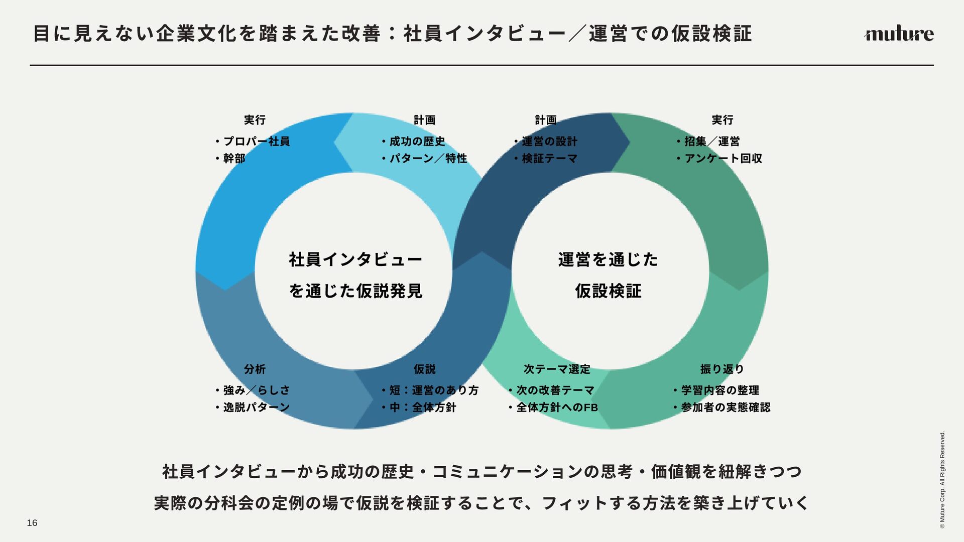 13. © Muture Corp. All Rights Reserved. 目に見えない企業文化を踏まえた改善:具体例 社員インタビュー を通じた仮説発見 運営を通じた