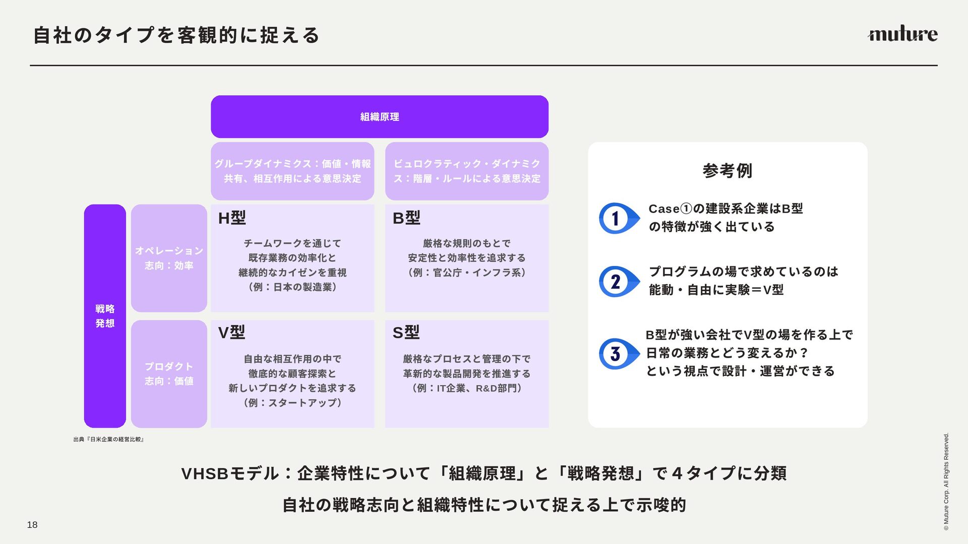 厳格なプロセスと管理の下で 革新的な製品開発を推進する (例:IT 企業、R&D 部門) 自由な相互作用の中で 徹底的な顧客探索と 新しいプロダクトを追求する (例:スタートアップ) チームワークを通じて 既存業務の効率化と 継続的なカイゼンを重視 (例:日本の製造業) VHSB モデル:企業特性について「組織原理」と「戦略発想」で4タイプに分類 自社の戦略志向と組織特性について捉える上で示唆的 グループダイナミクス:価値・情報 共有、相互作用による意思決定 ビュロクラティック・ダイナミク ス:階層・ルールによる意思決定 オペレーション 志向:効率 プロダクト 志向:価値 組織原理 戦略 発想 出典『日米企業の経営比較』 V 型 H 型 B 型 S 型 Case ①の建設系企業はB 型 の特徴が強く出ている プログラムの場で求めているのは 能動・自由に実験=V 型 B 型が強い会社でV 型の場を作る上で 日常の業務とどう変えるか? という視点で設計・運営ができる 18 参考例
