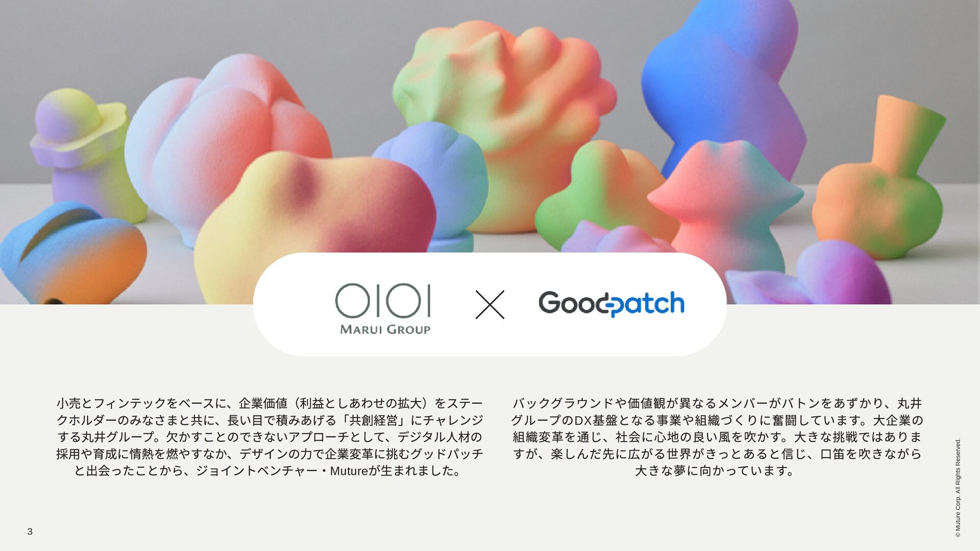2. © Muture Corp. All Rights Reserved. 小売とフィンテックをベースに、企業価値(利益としあわせの拡大)をステー クホルダーのみなさまと共に、長い目で積みあげる「共創経営」にチャレンジ する丸井グループ。欠かすことのできないアプローチとして、デジタル人材の 採用や育成に情熱を燃やすなか、デザインの力で企業変革に挑むグッドパッチ