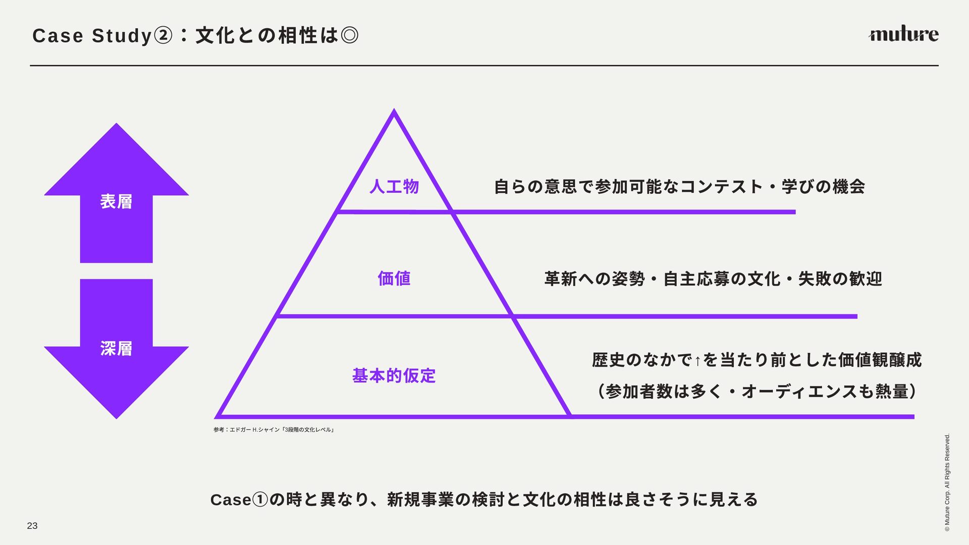 ①の時と異なり、新規事業の検討と文化の相性は良さそうに見える 表層 参考:エドガー H. シャイン「3 段階の文化レベル」 自らの意思で参加可能なコンテスト・学びの機会 革新への姿勢・自主応募の文化・失敗の歓迎 歴史のなかで↑ を当たり前とした価値観醸成 (参加者数は多く・オーディエンスも熱量) 人工物 価値 基本的仮定 深層 23