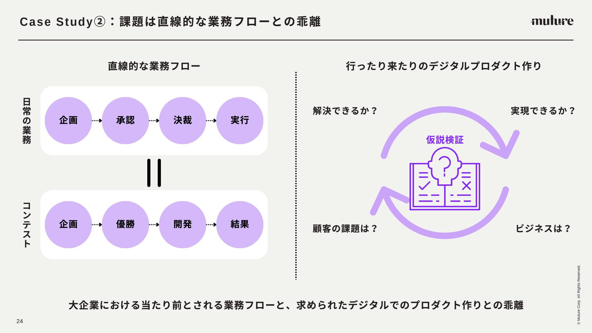 承認 決裁 実行 企画 優勝 開発 結果 大企業における当たり前とされる業務フローと、求められたデジタルでのプロダクト作りとの乖離 日 常 の 業 務 コ ン テ ス ト 顧客の課題は? 解決できるか? 仮説検証 実現できるか? ビジネスは? 直線的な業務フロー 行ったり来たりのデジタルプロダクト作り 24