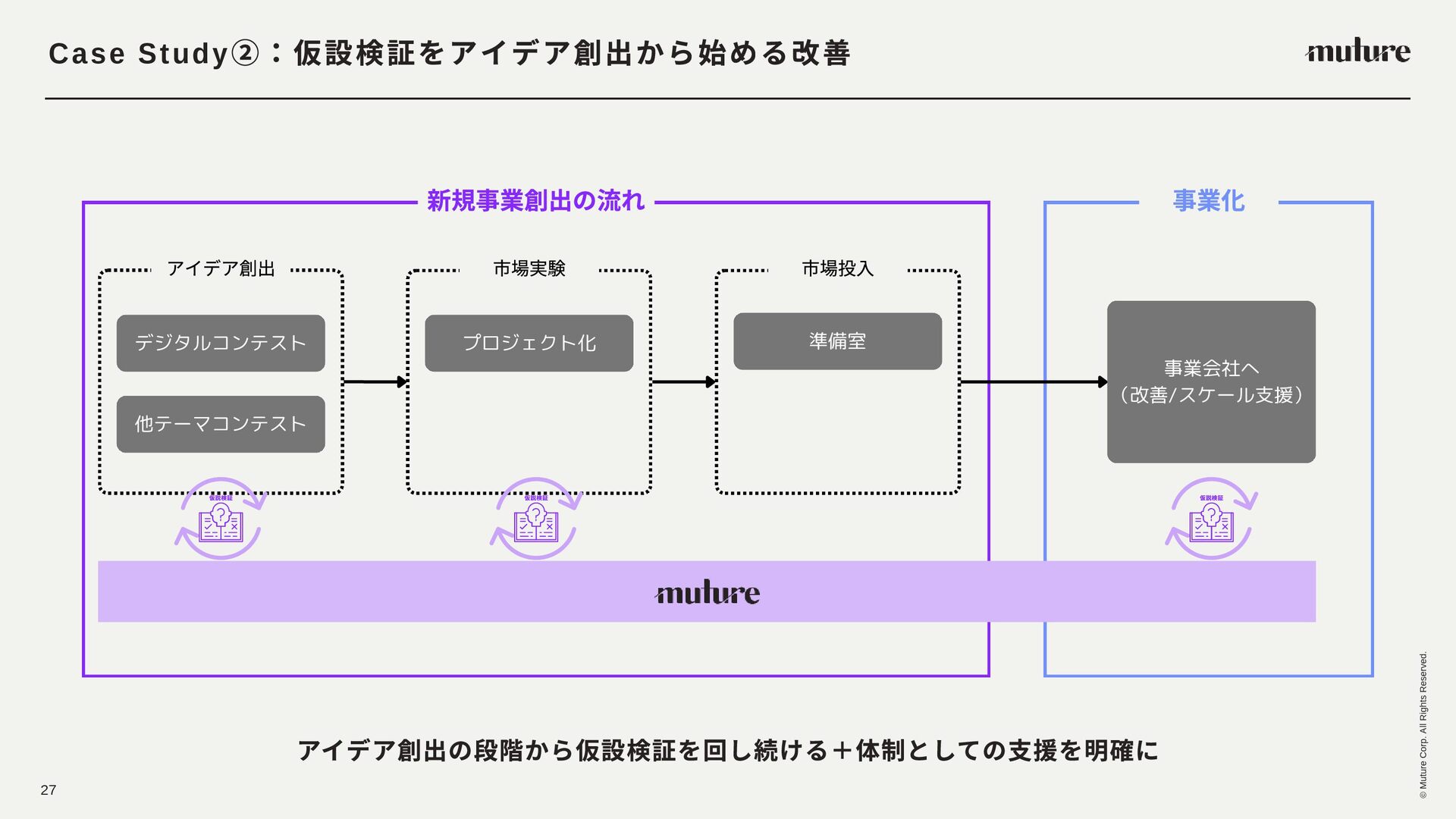 22. Case Study ②:仮設検証をアイデア創出から始める改善 © Muture Corp. All Rights Reserved. アイデア創出の段階から仮設検証を回し続ける+体制としての支援を明確に