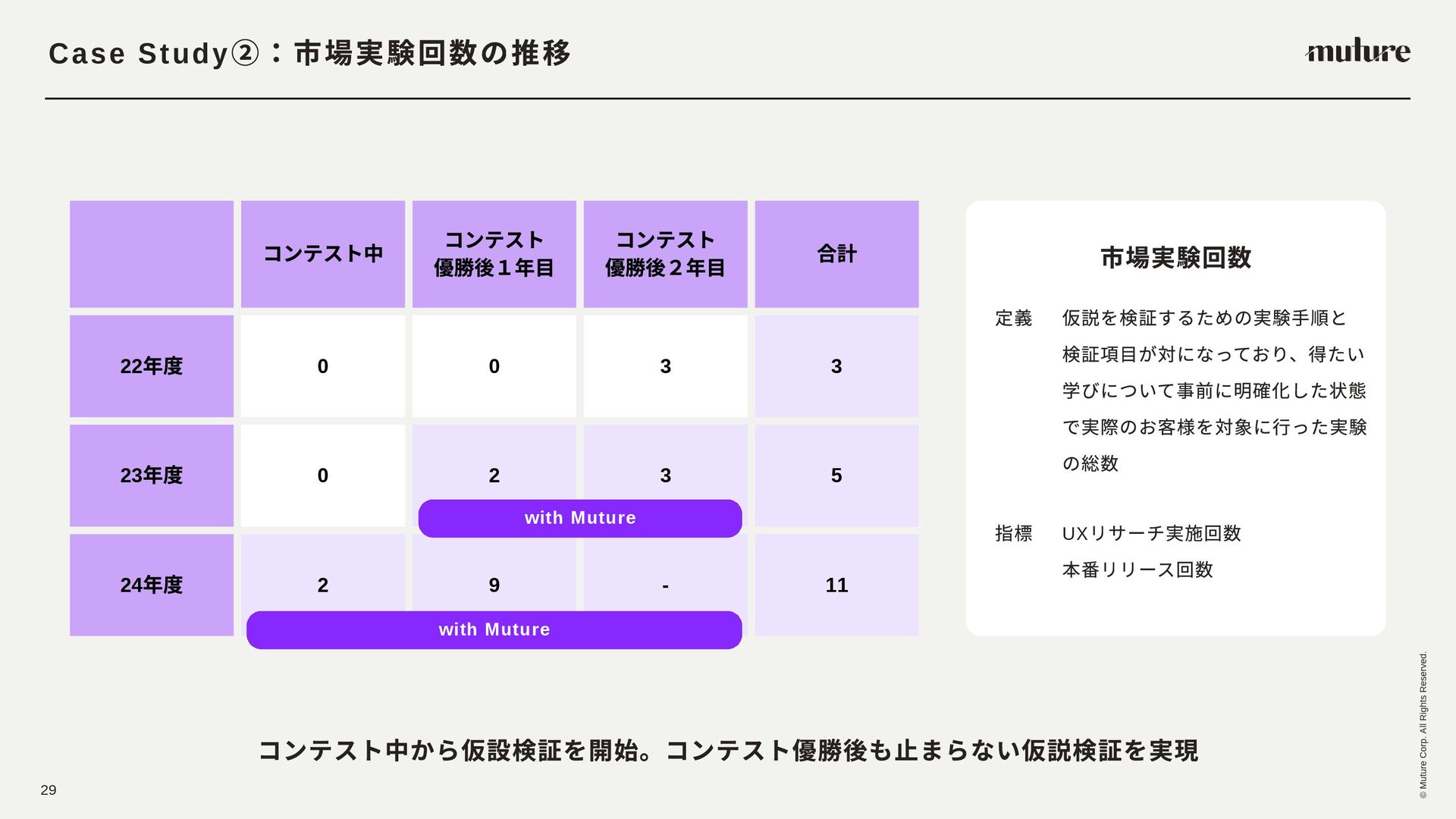 コンテスト 優勝後1年目 コンテスト 優勝後2年目 合計 22 年度 0 0 3 3 23 年度 0 2 3 5 24 年度 2 9 - 11 コンテスト中から仮設検証を開始。コンテスト優勝後も止まらない仮説検証を実現 市場実験回数 定義 指標 仮説を検証するための実験手順と 検証項目が対になっており、得たい 学びについて事前に明確化した状態 で実際のお客様を対象に行った実験 の総数 UX リサーチ実施回数 本番リリース回数 29 with Muture with Muture
