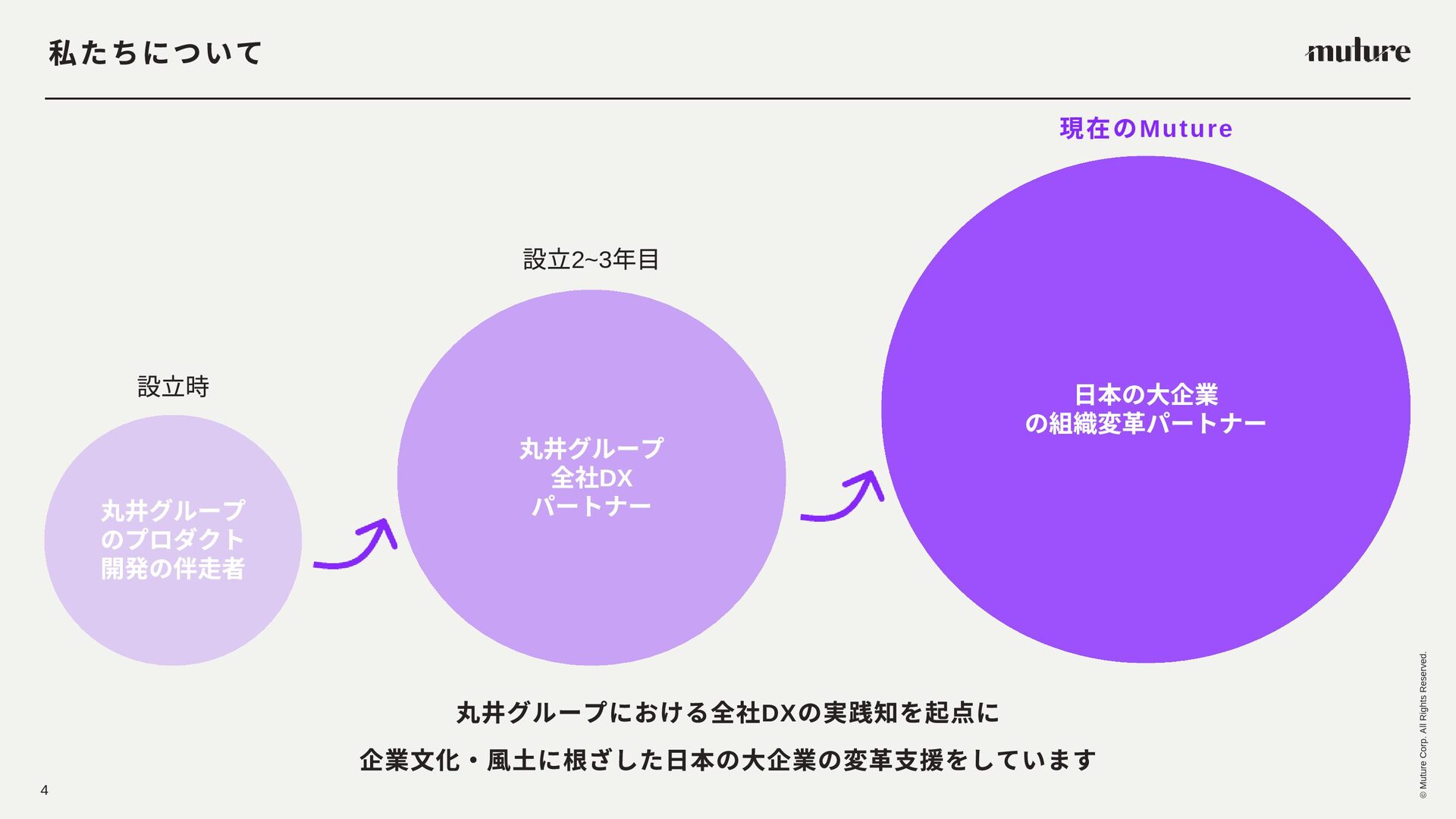 3. 私たちについて © Muture Corp. All Rights Reserved. 丸井グループにおける全社DX の実践知を起点に 企業文化・風土に根ざした日本の大企業の変革支援をしています