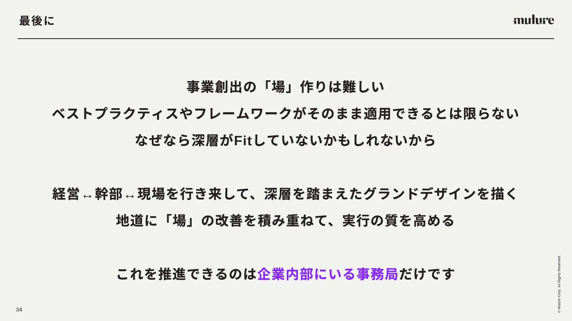 28. 最後に © Muture Corp. All Rights Reserved. 事業創出の「場」作りは難しい ベストプラクティスやフレームワークがそのまま適用できるとは限らない なぜなら深層がFit
