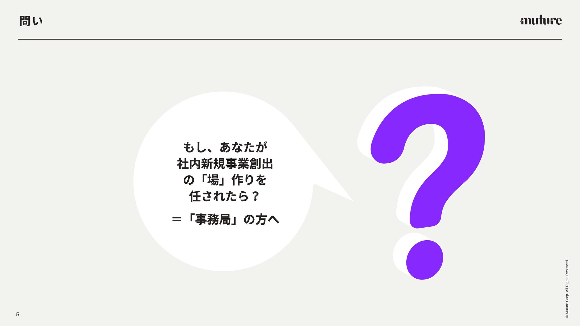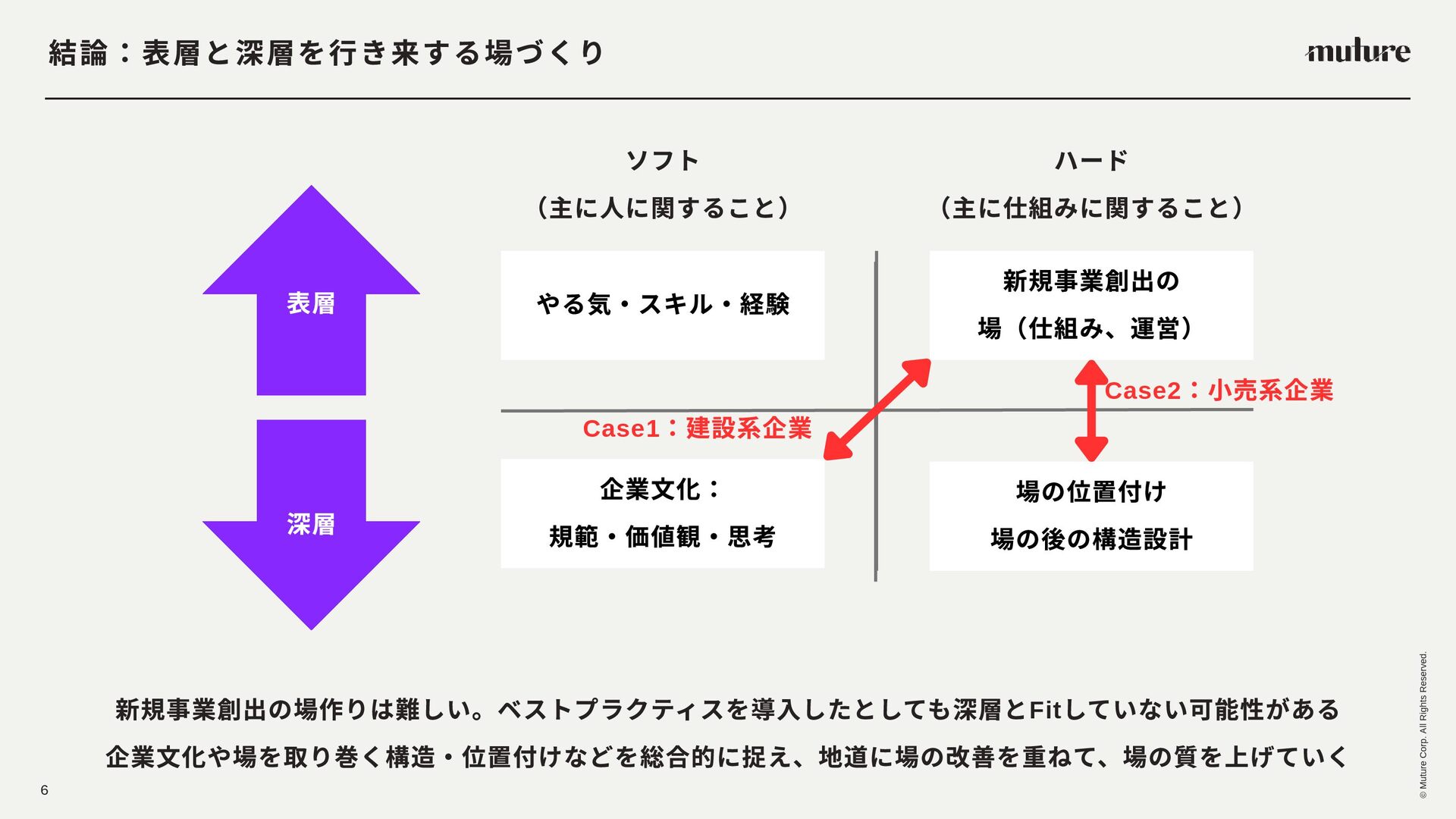 4. 結論:表層と深層を行き来する場づくり © Muture Corp. All Rights Reserved. 新規事業創出の場作りは難しい。ベストプラクティスを導入したとしても深層とFit していない可能性がある 企業文化や場を取り巻く構造・位置付けなどを総合的に捉え、地道に場の改善を重ねて、場の質を上げていく