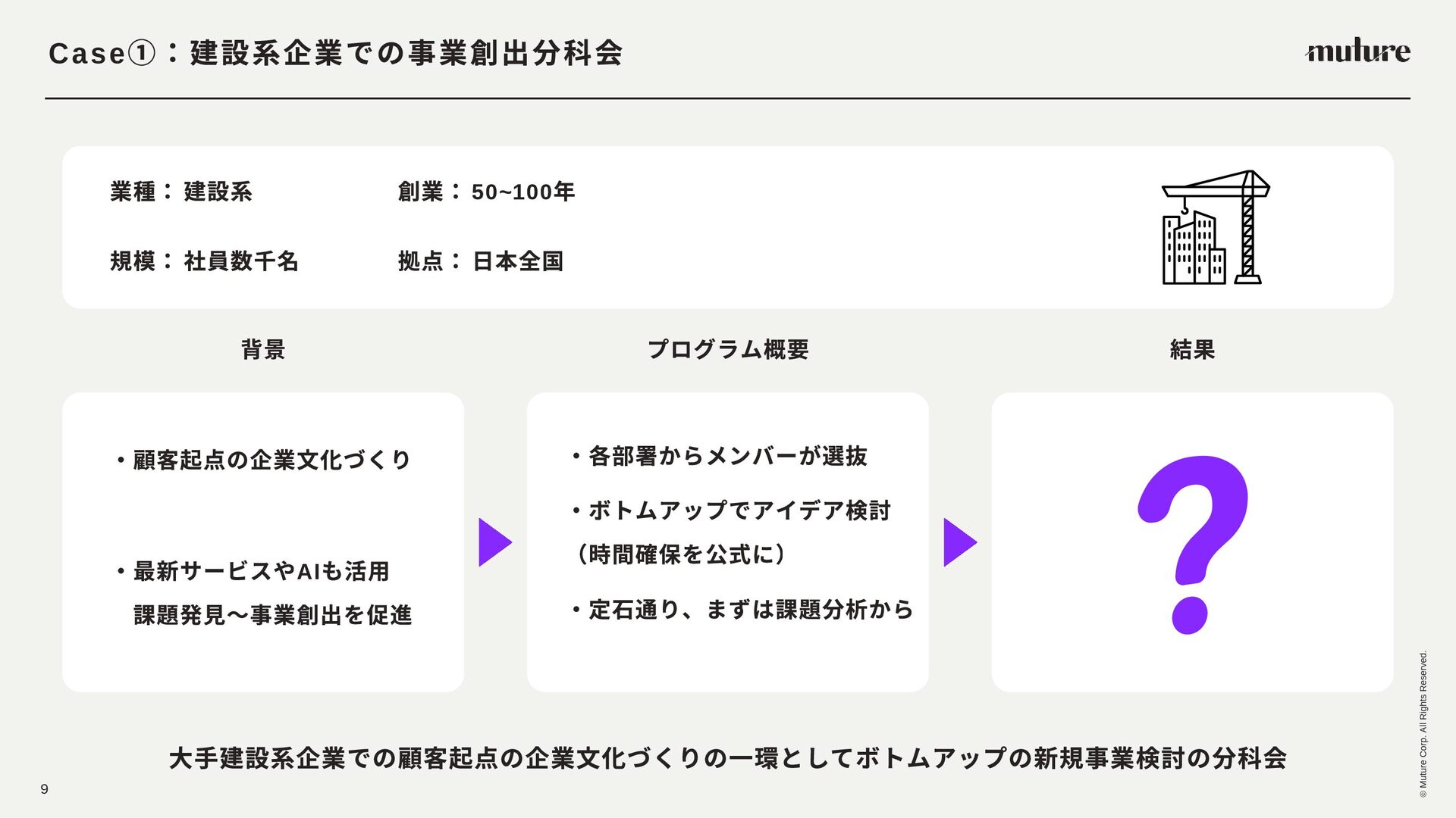 9. Case Study ①:企業らしさと新規事業創出との相性 © Muture Corp. All Rights Reserved. 事業(対顧客・市場)で培ってきた成功の歴史・コミュニケーションの蓄積