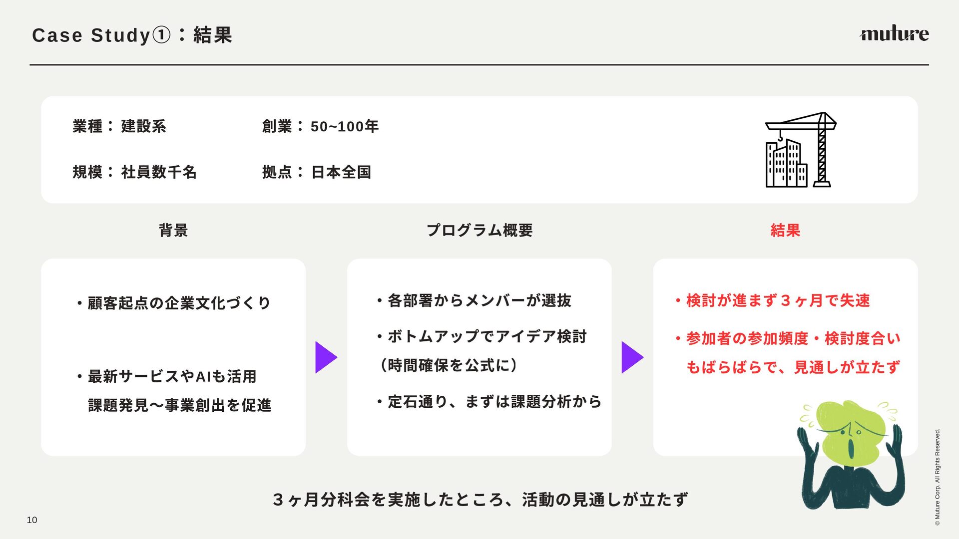 規模: 背景 プログラム概要 結果 建設系 社員数千名 創業:50~100 年 拠点:日本全国 ・顧客起点の企業文化づくり ・最新サービスやAI も活用  課題発見〜事業創出を促進 ・各部署からメンバーが選抜 ・定石通り、まずは課題分析から ・ボトムアップでアイデア検討 (時間確保を公式に) 9