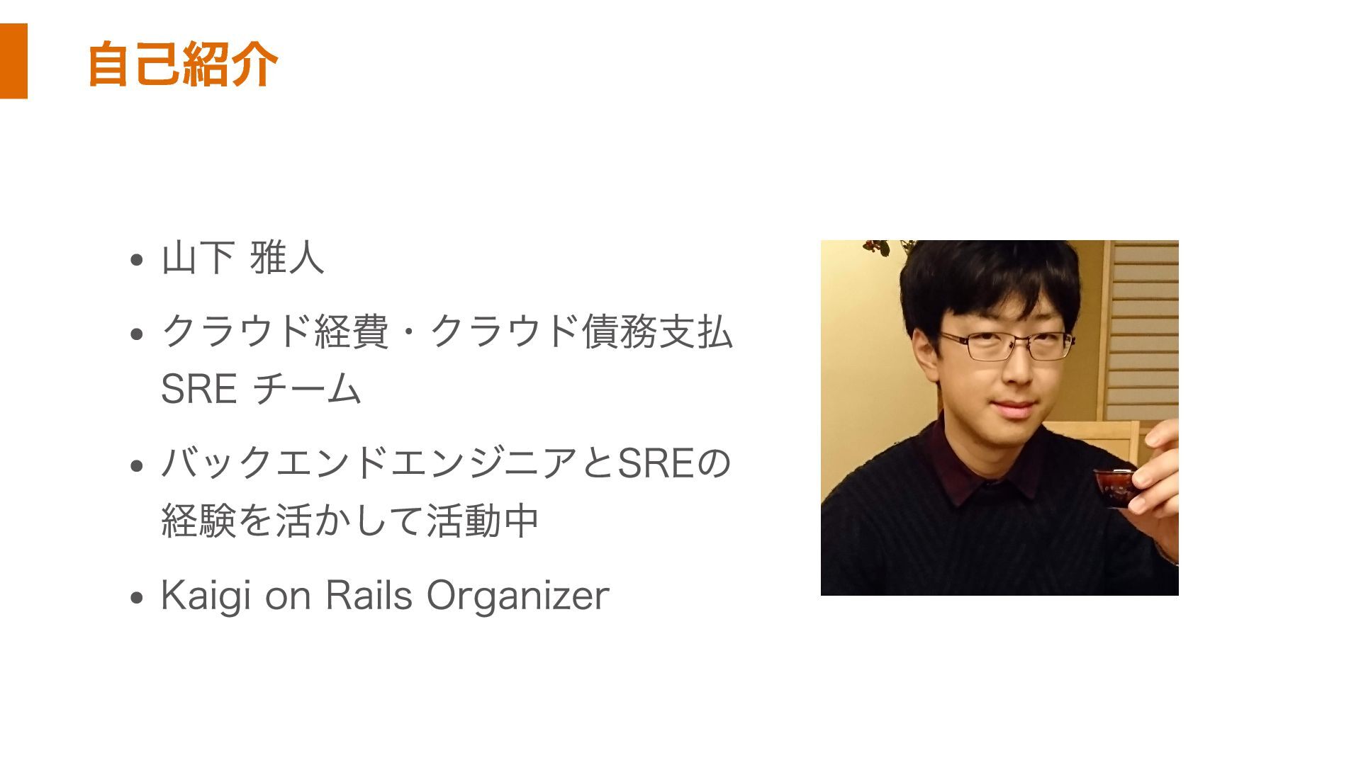自己紹介 山下 雅人 クラウド経費・クラウド債務支払 SRE チーム バックエンドエンジニアとSREの 経験を活かして活動中 Kaigi on