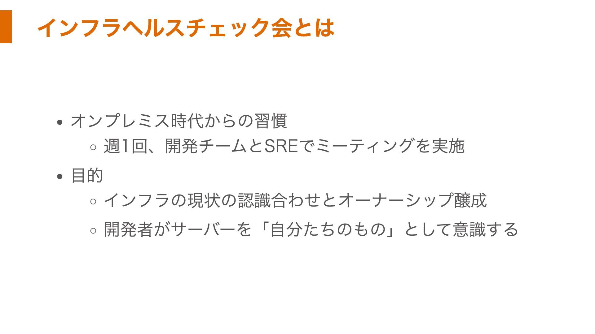 インフラヘルスチェック会とは オンプレミス時代からの習慣 週1回、開発チームとSREでミーティングを実施 目的 インフラの現状の認識合わせとオーナーシップ醸成 開発者がサーバーを「自分たちのもの」として意識する
