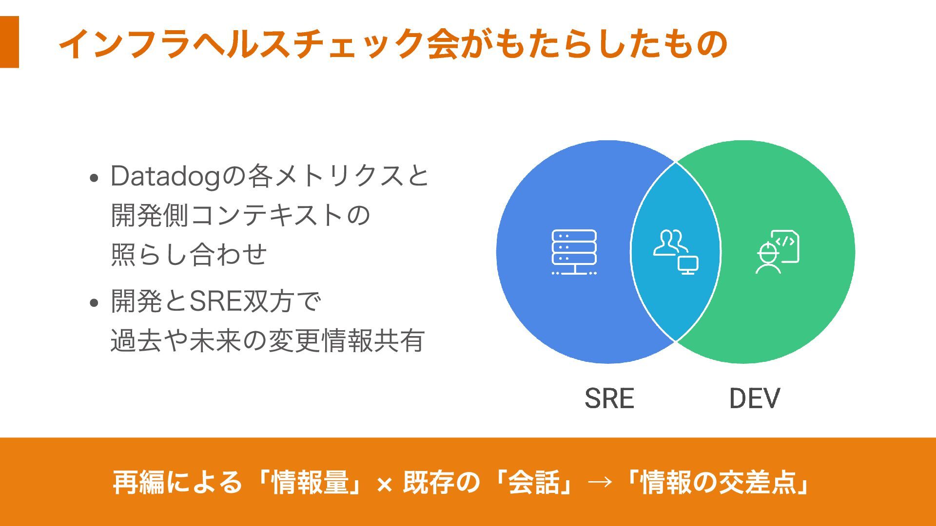 インフラヘルスチェック会がもたらしたもの Datadogの各メトリクスと 開発側コンテキストの 照らし合わせ 開発とSRE双方で 過去や未来の変更情報共有 再編による「情報量」× 既存の「会話」→「情報の交差点」