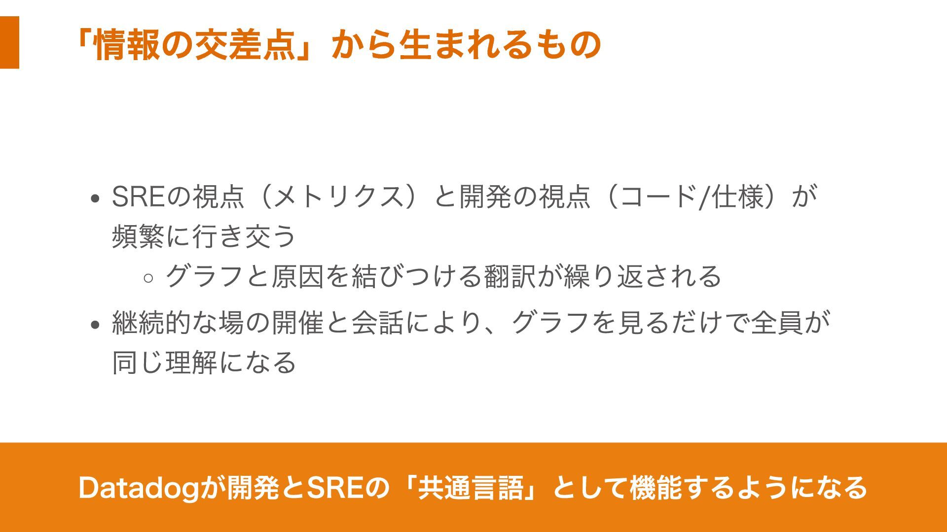 「情報の交差点」から生まれるもの SREの視点(メトリクス)と開発の視点(コード/仕様)が 頻繁に行き交う グラフと原因を結びつける翻訳が繰り返される 継続的な場の開催と会話により、グラフを見るだけで全員が 同じ理解になる Datadogが開発とSREの「共通言語」として機能するようになる