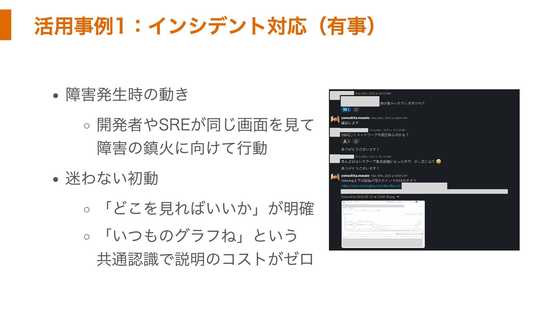 活用事例1:インシデント対応(有事) 障害発生時の動き 開発者やSREが同じ画面を見て 障害の鎮火に向けて行動 迷わない初動 「どこを見ればいいか」が明確 「いつものグラフね」という 共通認識で説明のコストがゼロ