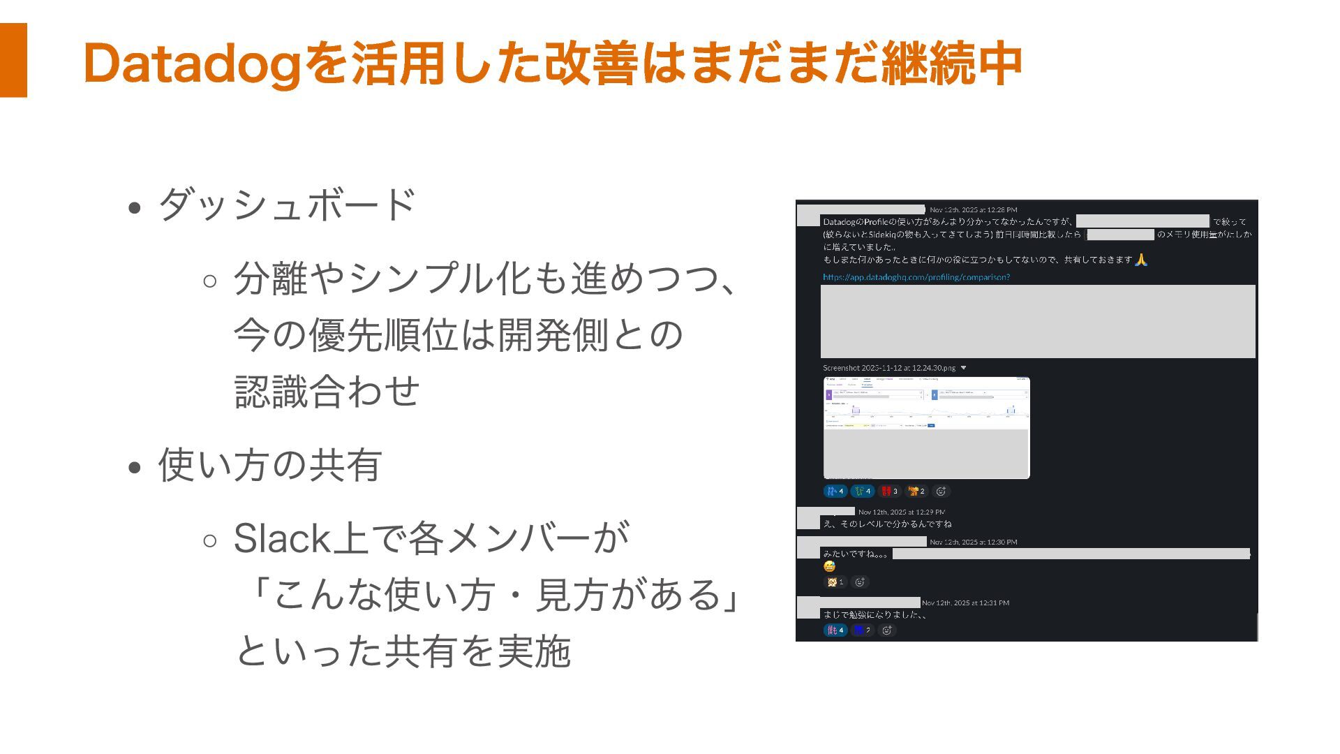 Datadogを活用した改善はまだまだ継続中 ダッシュボード 分離やシンプル化も進めつつ、 今の優先順位は開発側との 認識合わせ 使い方の共有 Slack上で各メンバーが 「こんな使い方・見方がある」 といった共有を実施
