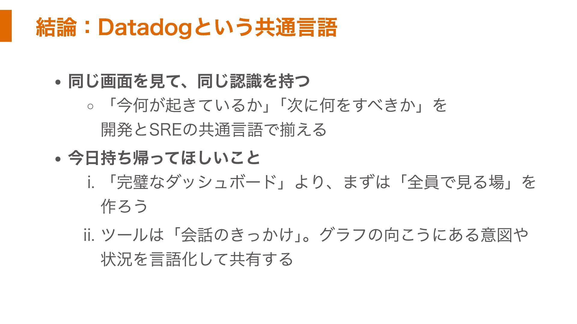 結論:Datadogという共通言語 同じ画面を見て、同じ認識を持つ 「今何が起きているか」 「次に何をすべきか」を 開発とSREの共通言語で揃える 今日持ち帰ってほしいこと i. 「完璧なダッシュボード」より、まずは「全員で見る場」を 作ろう ii.