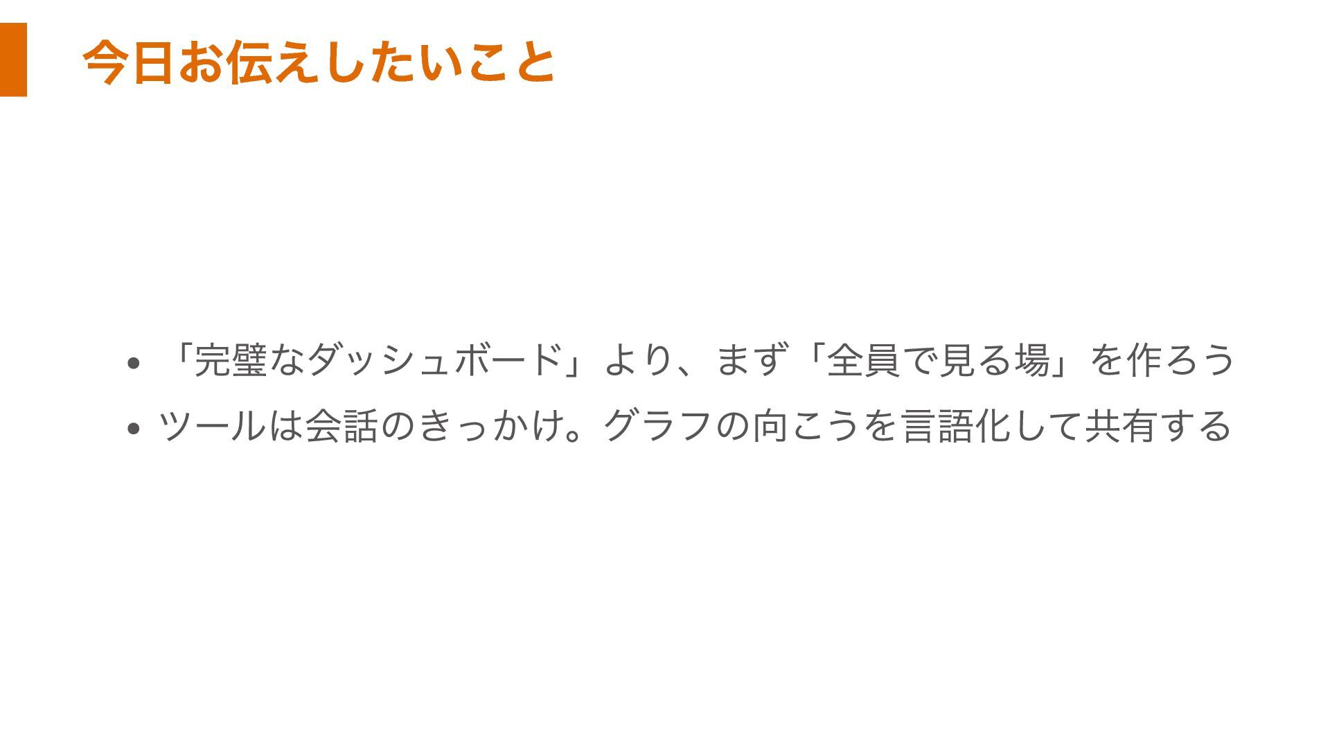 今日お伝えしたいこと 「完璧なダッシュボード」より、まず「全員で見る場」を作ろう ツールは会話のきっかけ。グラフの向こうを言語化して共有する