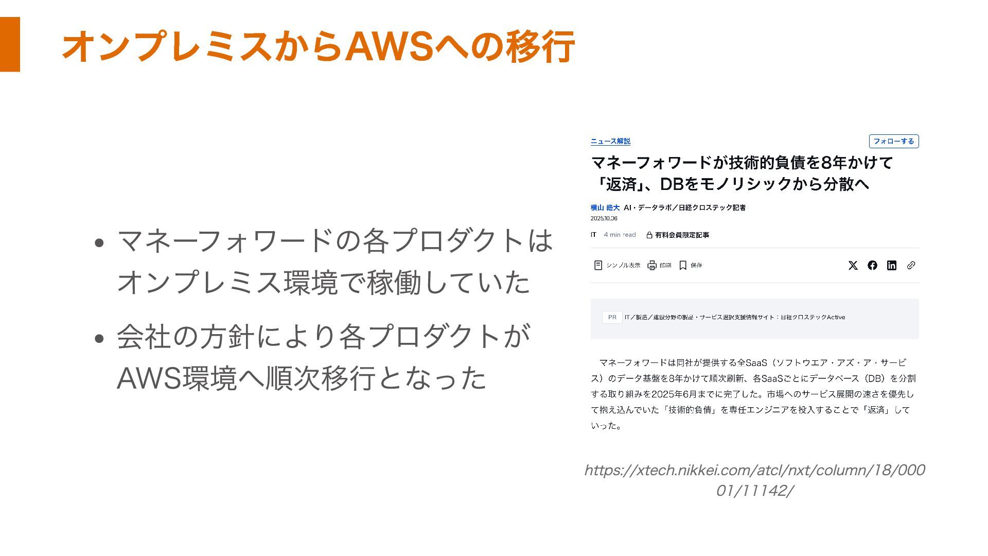 オンプレミスからAWSへの移行 マネーフォワードの各プロダクトは オンプレミス環境で稼働していた 会社の方針により各プロダクトが AWS環境へ順次移行となった https://xtech.nikkei.com/atcl/nxt/column/18/000 01/11142/