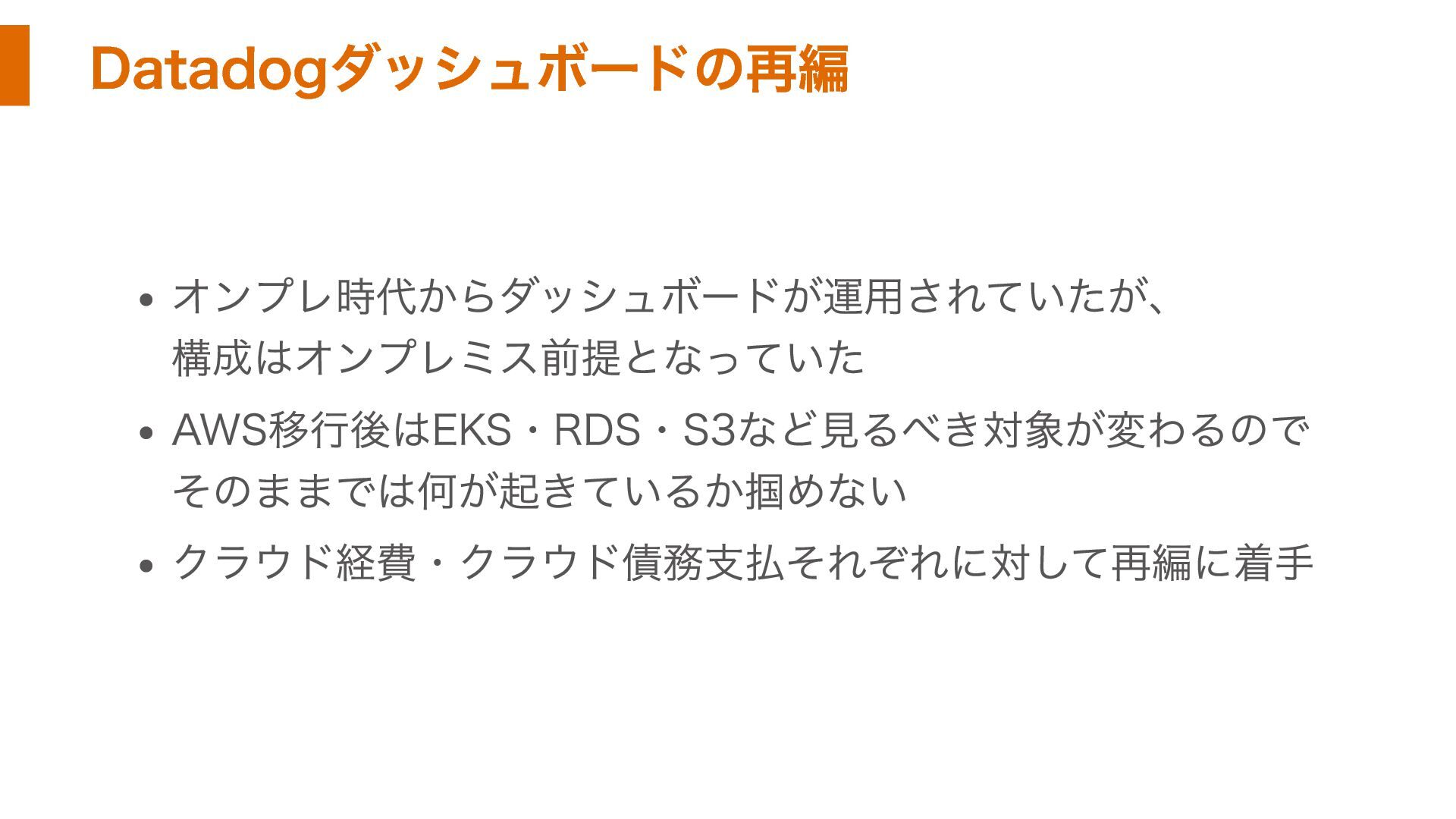 Datadogダッシュボードの再編 オンプレ時代からダッシュボードが運用されていたが、 構成はオンプレミス前提となっていた AWS移行後はEKS・RDS・S3など見るべき対象が変わるので そのままでは何が起きているか掴めない クラウド経費・クラウド債務支払それぞれに対して再編に着手