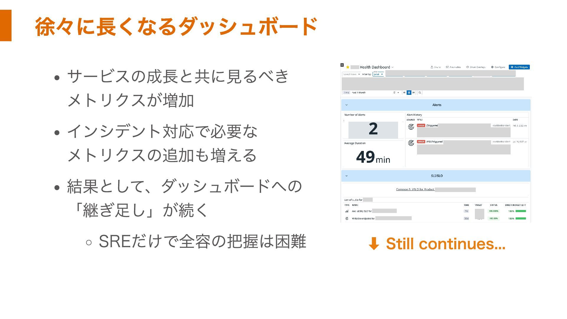 徐々に長くなるダッシュボード サービスの成長と共に見るべき メトリクスが増加 インシデント対応で必要な メトリクスの追加も増える 結果として、ダッシュボードへの 「継ぎ足し」が続く SREだけで全容の把握は困難 ⬇︎ Still