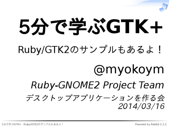5分で学ぶGTK+ - Ruby/GTK2のサンプルもあるよ! Powered by Rabbit 2.1.2 サンプルコード全⽂ https://gist.github.com/myokoym/9489619