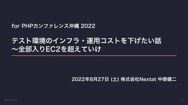 for PHPカンファレンス沖縄 2022 テスト環境のインフラ・運用コストを下げたい話 〜全部入りEC2を超えていけ 2022年8月27日 (土) 株式会社Nextat 中榮健二 Nextat