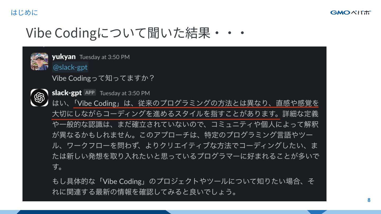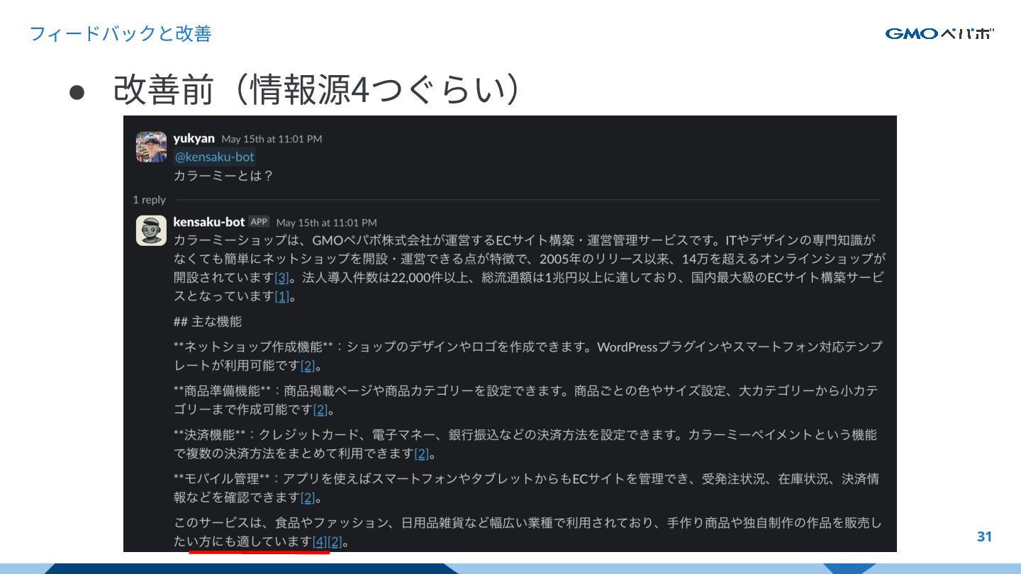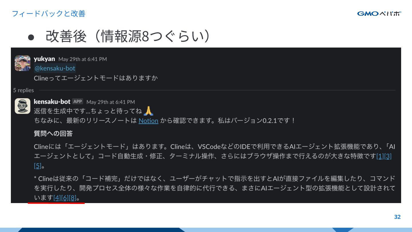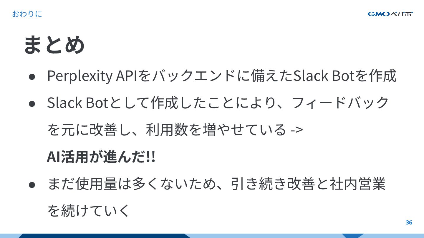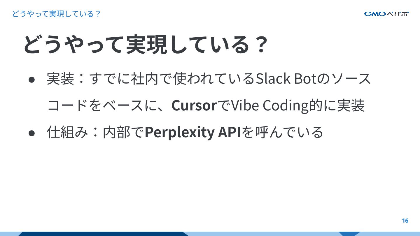 Perplexity APIを活用してkensaku-botというSlack Botを開発しました。メンションをトリガーとしたウェブ検索で最新情報に基づいた応答を生成します。これにより、既存のOpenAI APIを利用したBotが抱える知識カットオフの問題を克服し、社内でのAI活用を促進することを目指しています。このスライドでは、kensaku-bot制作の過程と改善、そしてどの程度目的を達成できたのかを紹介します。