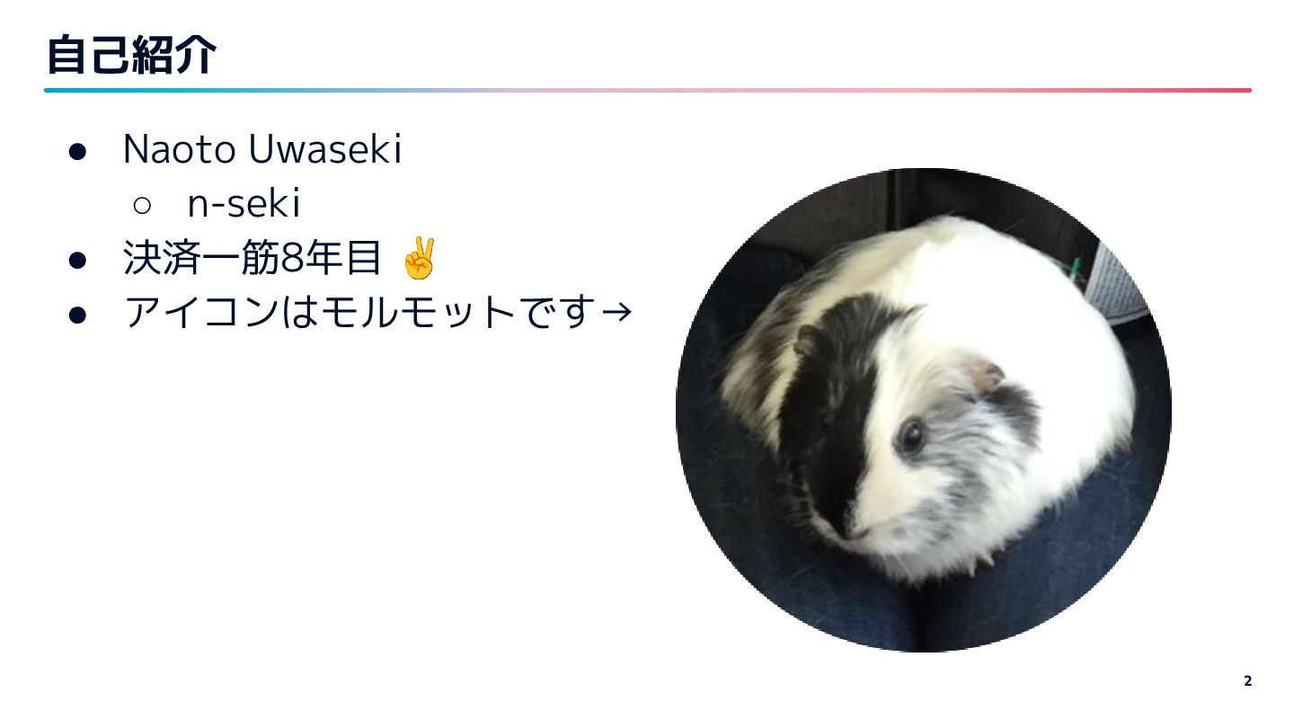 自己紹介 2 • Naoto Uwaseki ◦ n-seki • 決済一筋8年目 ✌