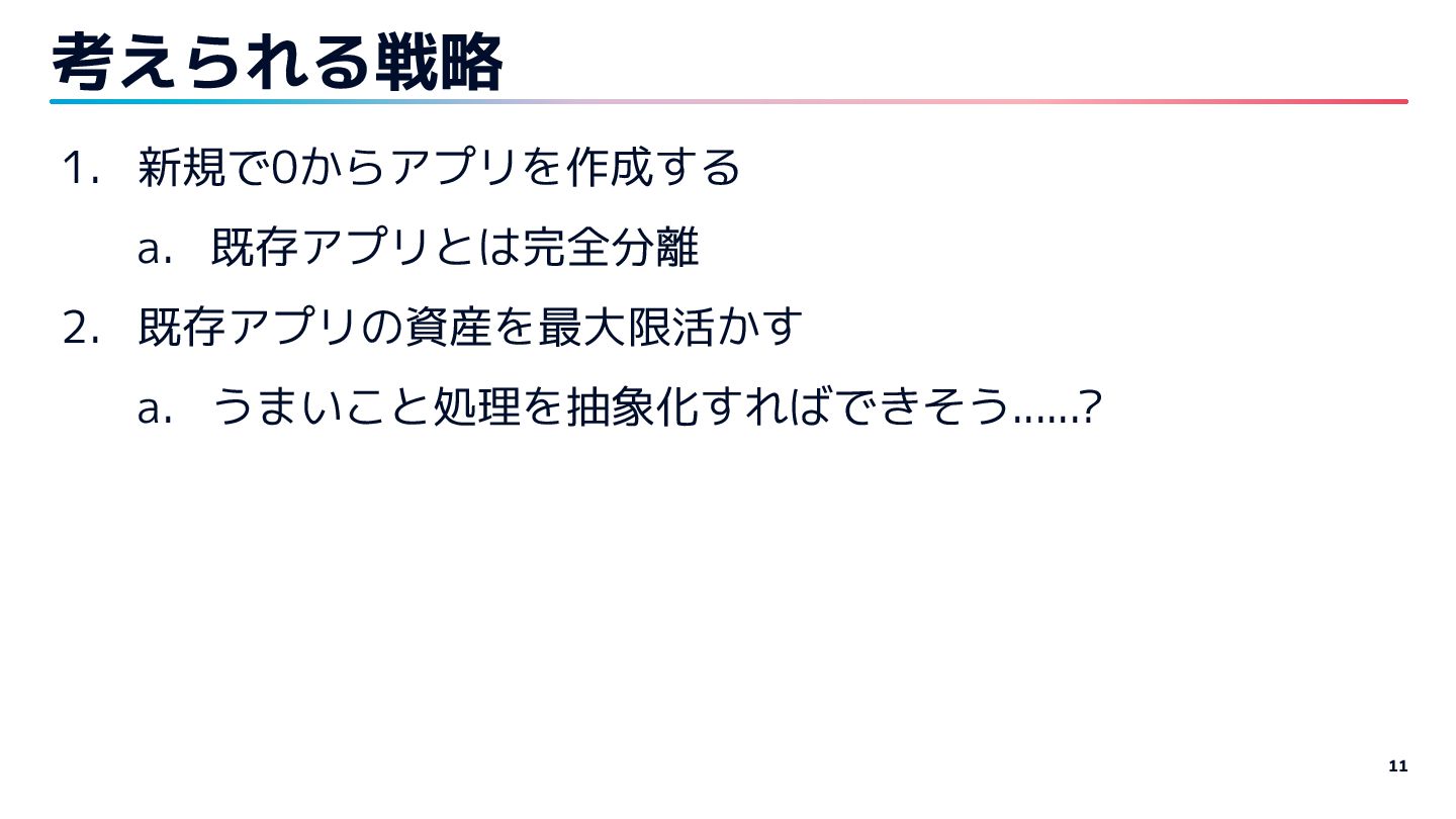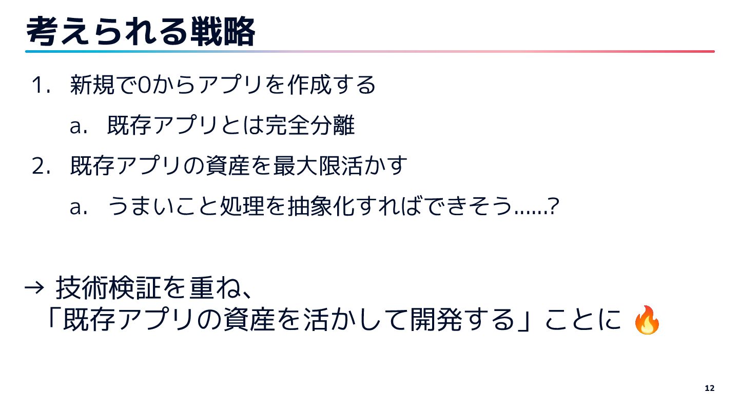 考えられる戦略 11 1. 新規で0からアプリを作成する a. 既存アプリとは完全分離 2. 既存アプリの資産を最大限活かす a. うまいこと処理を抽象化すればできそう......?