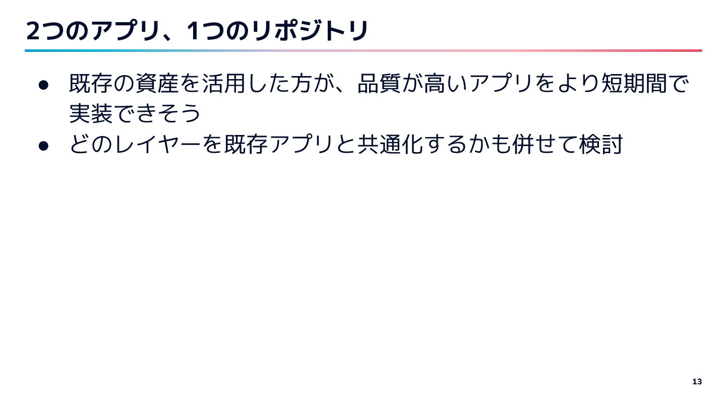2つのアプリ、1つのリポジトリ 13 • 既存の資産を活用した方が、品質が高いアプリをより短期間で 実装できそう • どのレイヤーを既存アプリと共通化するかも併せて検討