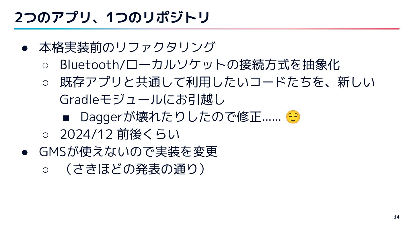 2つのアプリ、1つのリポジトリ 14 • 本格実装前のリファクタリング ◦ Bluetooth/ローカルソケットの接続方式を抽象化 ◦ 既存アプリと共通して利用したいコードたちを、新しい Gradleモジュールにお引越し ▪