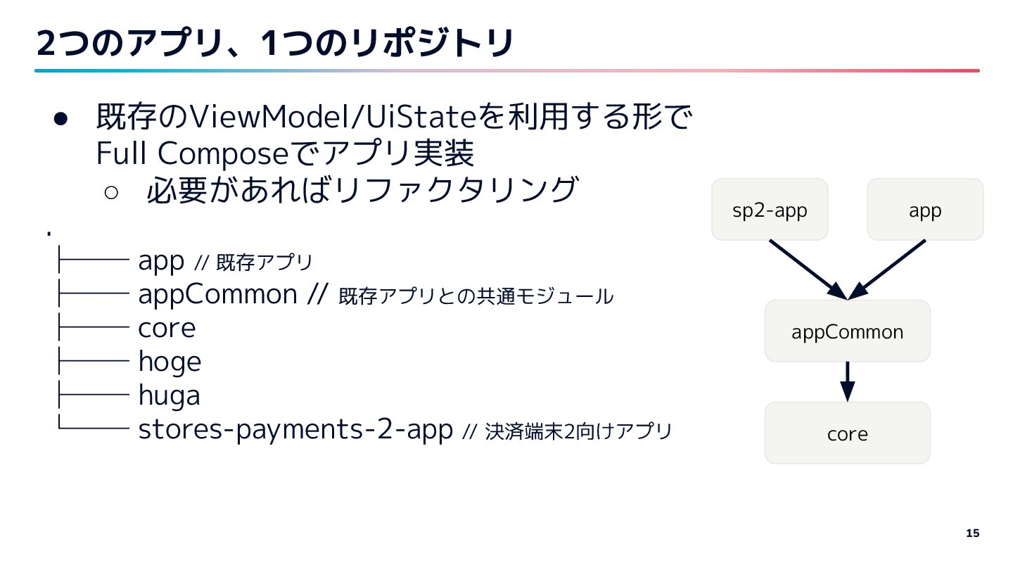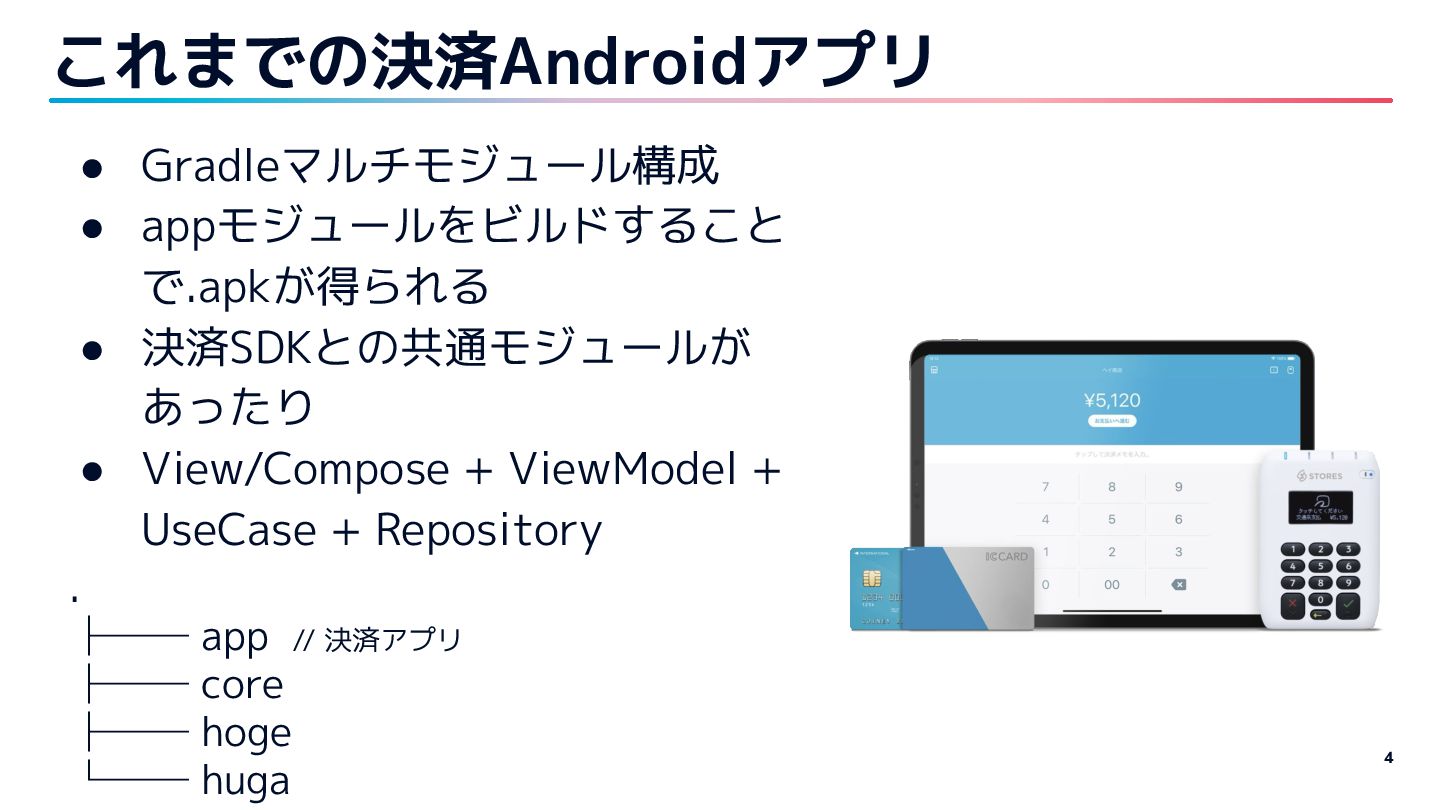 app // 既存アプリ ├── appCommon // 既存アプリとの共通モジュール ├── core ├── hoge ├── huga └── stores-payments-2-app // 決済端末2向けアプリ sp2-app app appCommon core