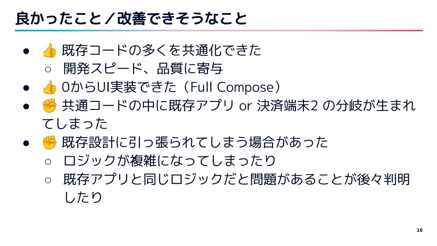 Compose) • ✊ 共通コードの中に既存アプリ or 決済端末2 の分岐が生まれ てしまった • ✊ 既存設計に引っ張られてしまう場合があった ◦ ロジックが複雑になってしまったり ◦ 既存アプリと同じロジックだと問題があることが後々判明 したり