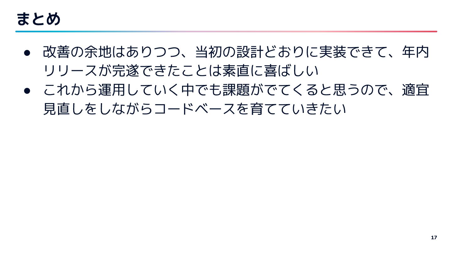 まとめ 17 • 改善の余地はありつつ、当初の設計どおりに実装できて、年内 リリースが完遂できたことは素直に喜ばしい • これから運用していく中でも課題がでてくると思うので、適宜 見直しをしながらコードベースを育てていきたい