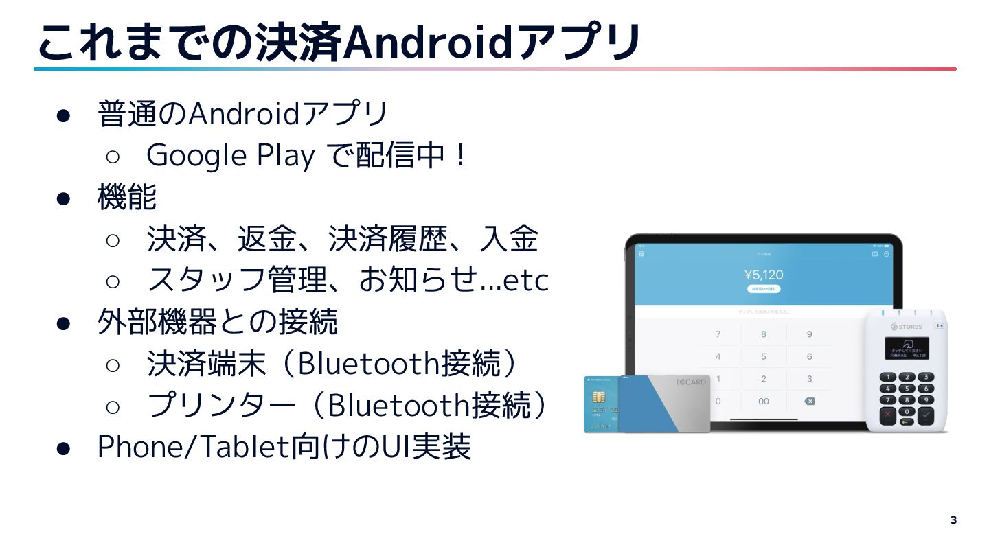 これまでの決済Androidアプリ 3 • 普通のAndroidアプリ ◦ Google Play で配信中! • 機能