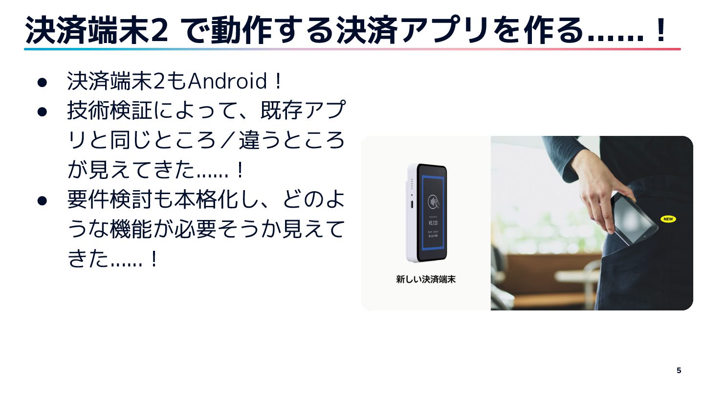 • 決済端末2もAndroid! • 技術検証によって、既存アプ リと同じところ/違うところ が見えてきた......! • 要件検討も本格化し、どのよ うな機能が必要そうか見えて きた......!