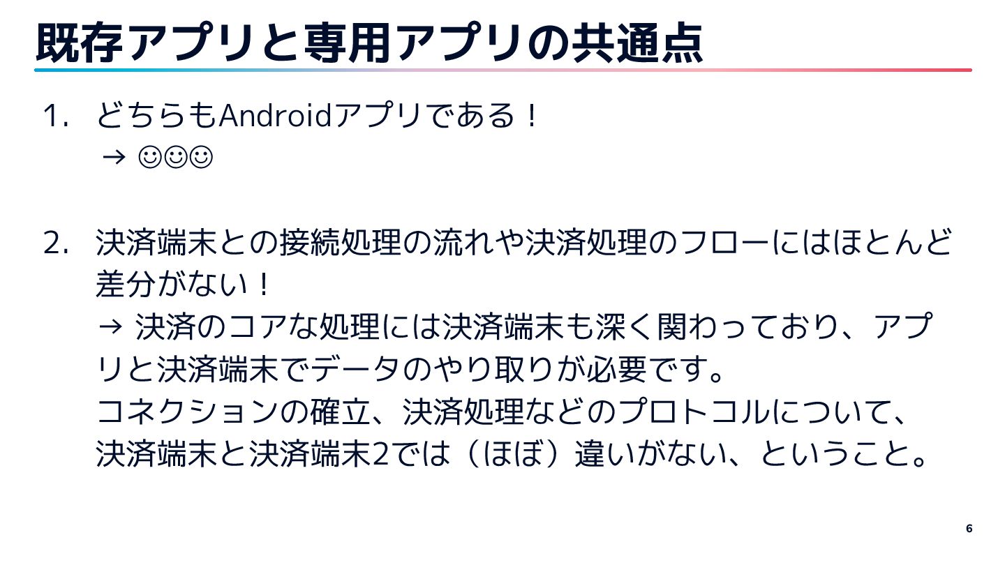 既存アプリと専用アプリの共通点 6 1. どちらもAndroidアプリである! → ☺☺☺ 2. 決済端末との接続処理の流れや決済処理のフローにはほとんど 差分がない! →