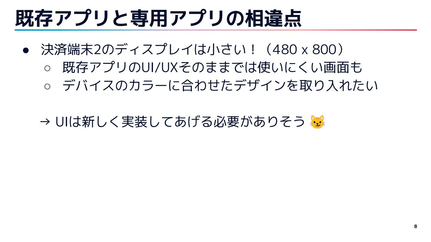 • 決済端末2のディスプレイは小さい!(480 x 800) ◦ 既存アプリのUI/UXそのままでは使いにくい画面も ◦ デバイスのカラーに合わせたデザインを取り入れたい → UIは新しく実装してあげる必要がありそう