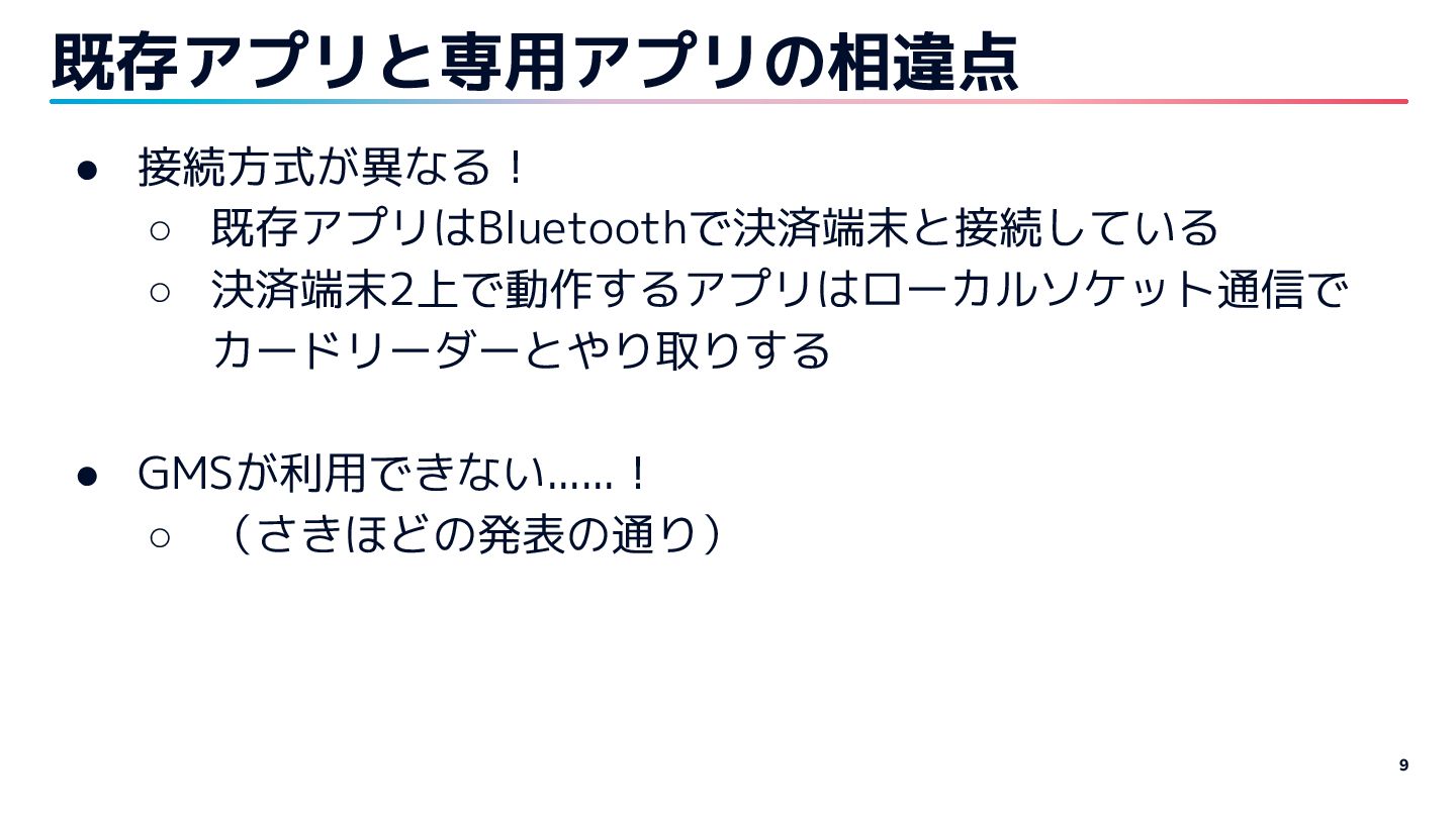• 接続方式が異なる! ◦ 既存アプリはBluetoothで決済端末と接続している ◦ 決済端末2上で動作するアプリはローカルソケット通信で カードリーダーとやり取りする • GMSが利用できない......! ◦
