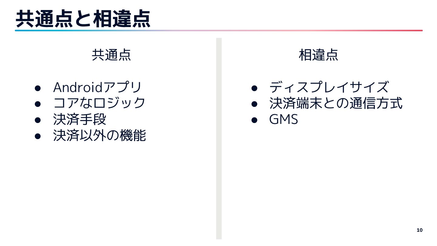 共通点と相違点 10 共通点 相違点 • Androidアプリ • コアなロジック • 決済手段