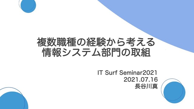「複数職種の経験から考える情報システム部門の取組」 経営課題の解決におけるIT戦略の重要度は年々高まっています。 エンジニア、人事、情シスと複数の職種を経験し、現在100名以下のベンチャー企業において、どのように情報システム部門の立ち上げを行っているのか、自身の社外活動、課題感なども踏まえ、皆様のお役に立ちそうな内容をお話できればと思います。