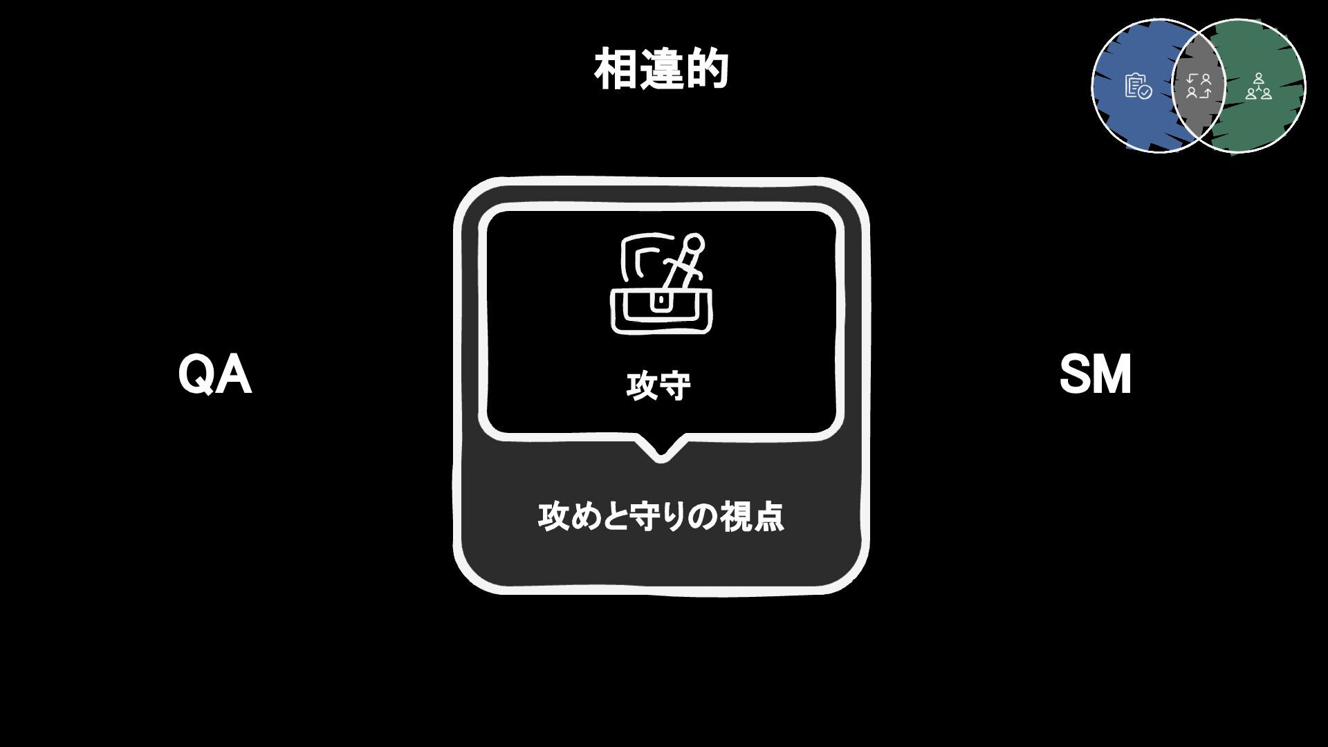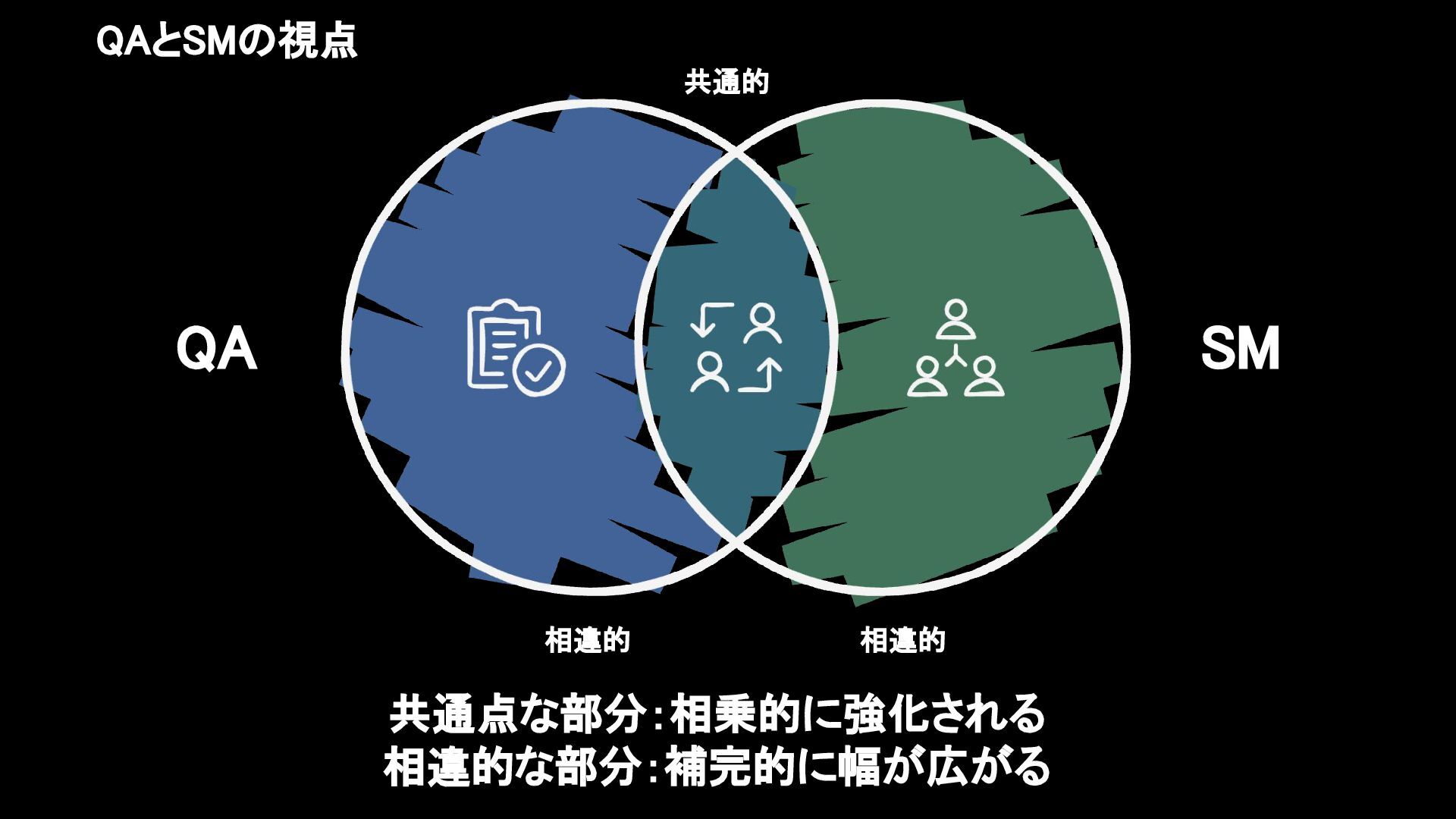 相違的 相違的 共通的 共通点な部分:相乗的に強化される 相違的な部分:補完的に幅が広がる QAとSMの視点 QA