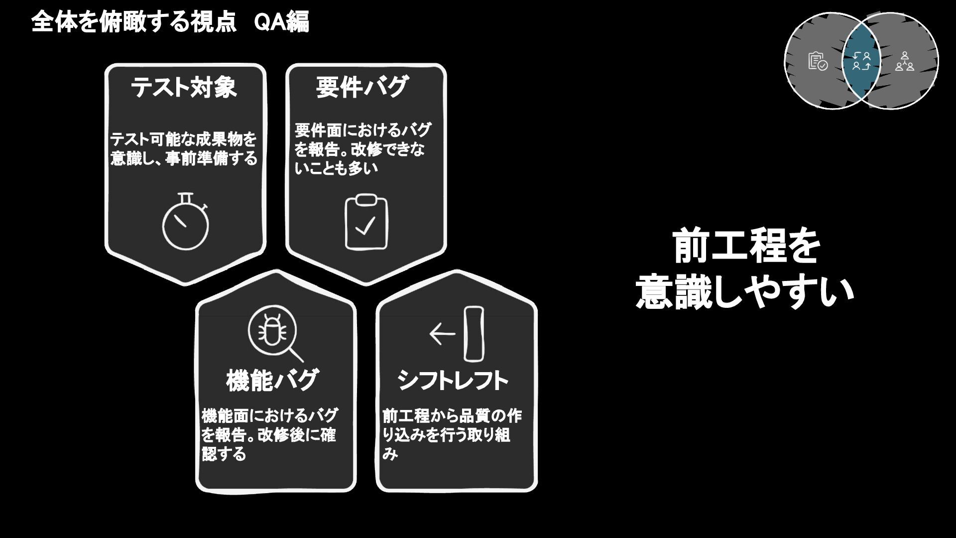要件定義 設計 開発 テスト 前工程を意識 全体俯瞰 全体を俯瞰する視点 QA編