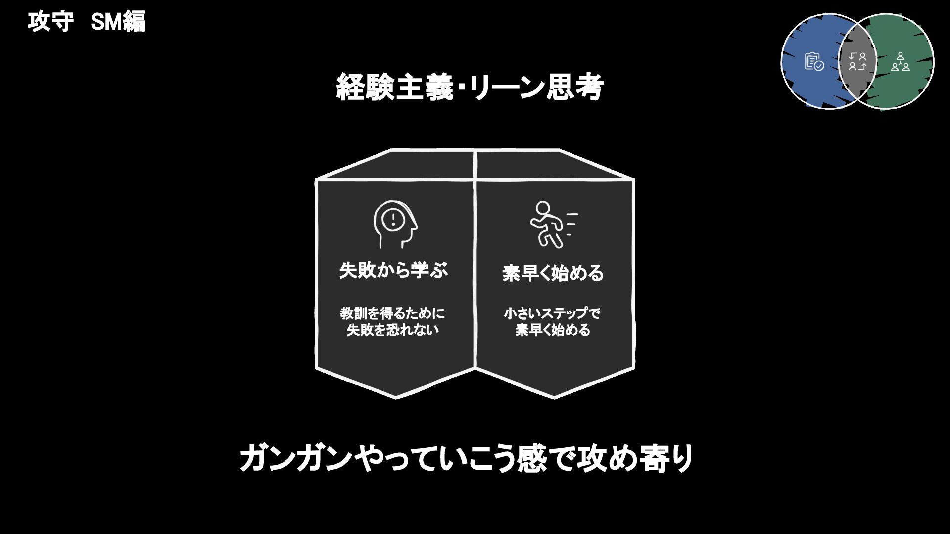 攻守 SM編 ガンガンやっていこう感で攻め寄り 失敗から学ぶ 素早く始める 小さいステップで