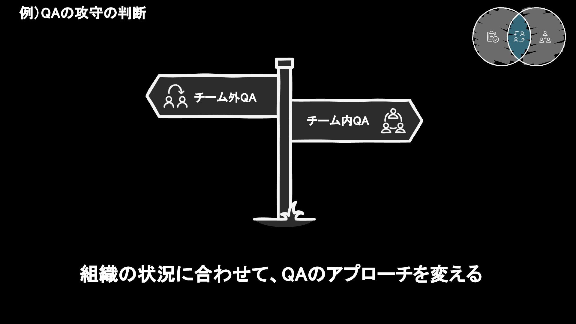 例)QAの攻守の判断 チーム外QA チーム内QA 組織の状況に合わせて、QAのアプローチを変える