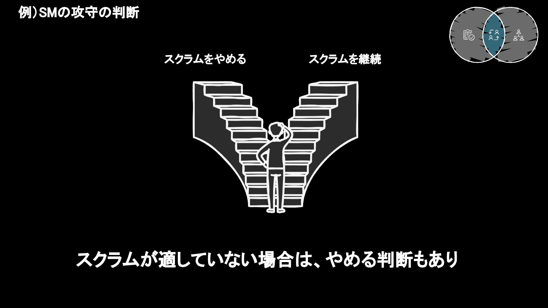 例)SMの攻守の判断 スクラムを継続 スクラムが適していない場合は、やめる判断もあり スクラムをやめる