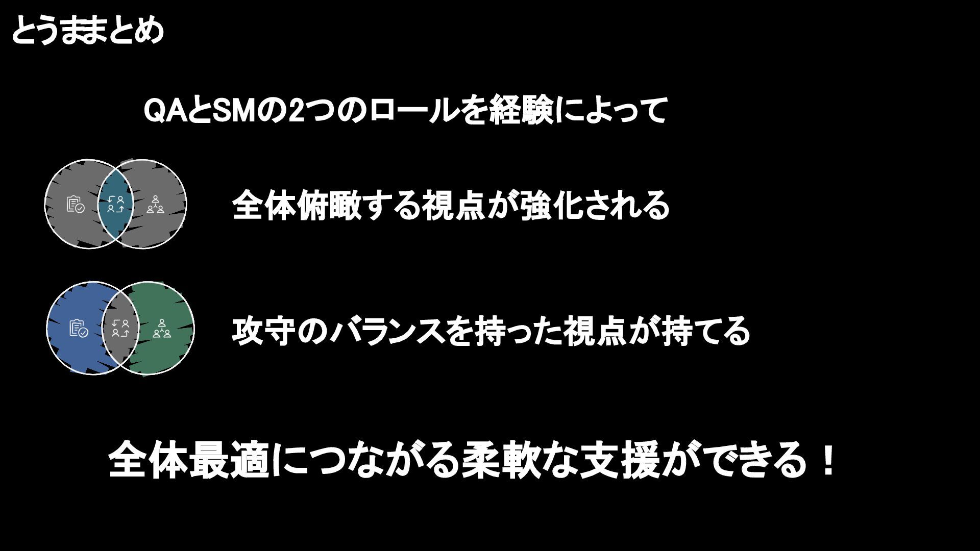 全体俯瞰する視点が強化される 攻守のバランスを持った視点が持てる QAとSMの2つのロールを経験によって 全体最適につながる柔軟な支援ができる! とうま まとめ