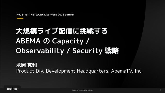 / Observability / Security 戦略 Nov 5, @IT NETWORK Live Week 2025 autumn 永岡 克利 Product Div, Development Headquarters, AbemaTV, Inc.